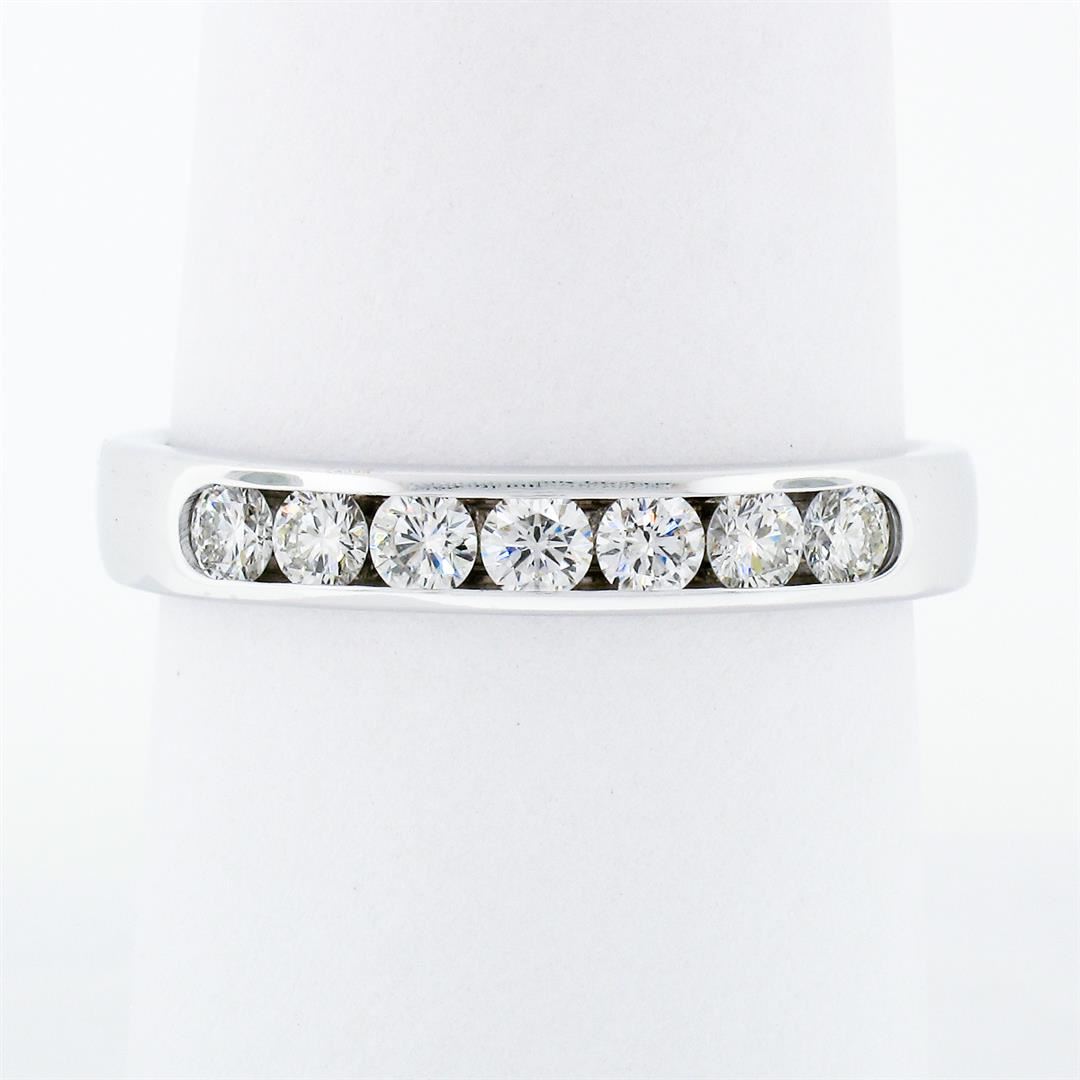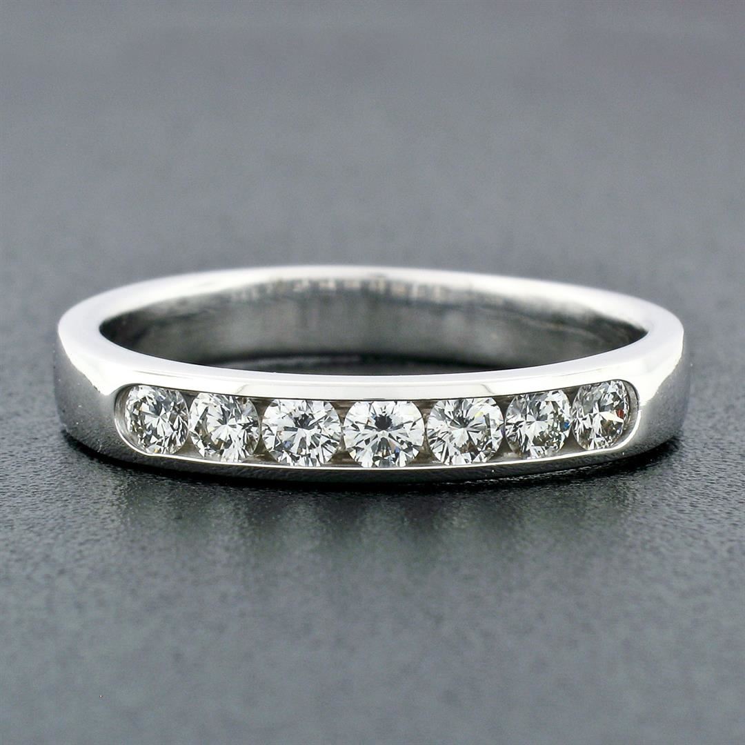 A solid 14k white gold stackable band ring with 7 round brilliant cut natural diamoinds (E/F - VVS1/VVS2; 0.50ctw). The ring is size 8.5, weighs a total of 3.66 grams, and measures 3.61mm wide.