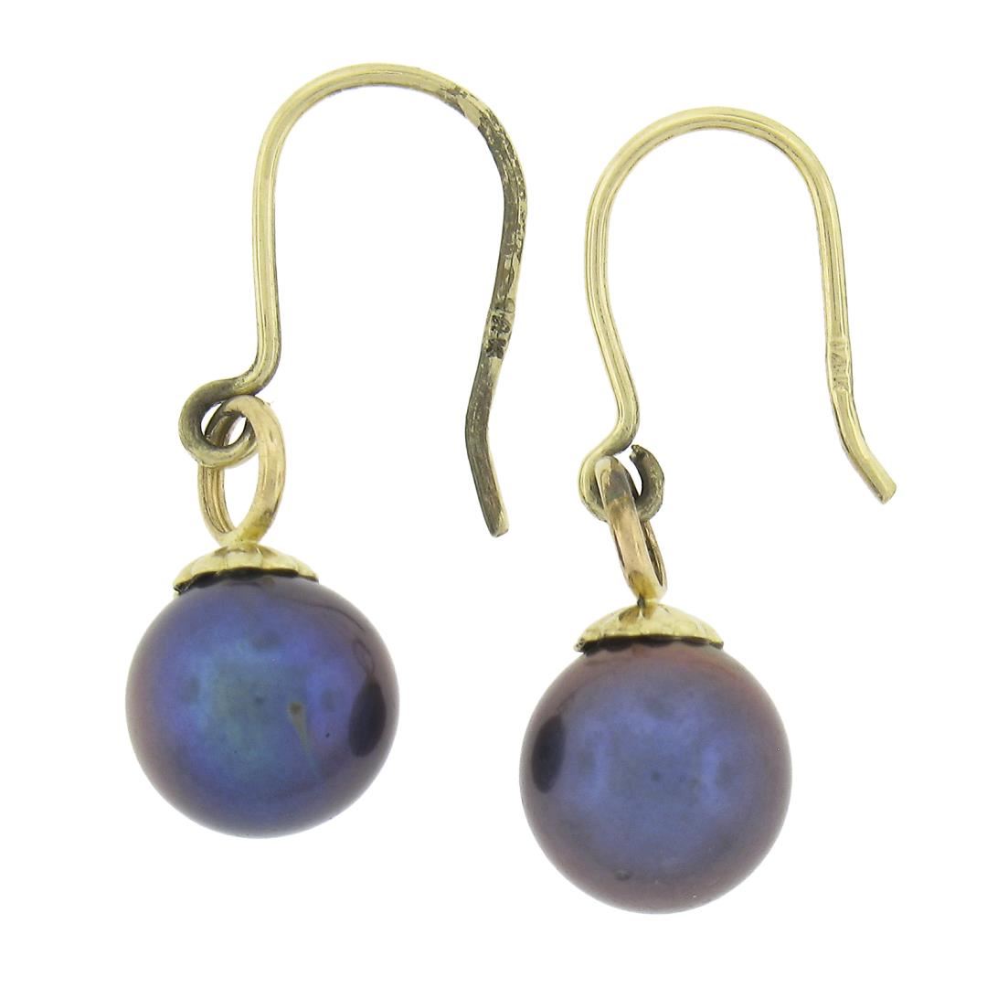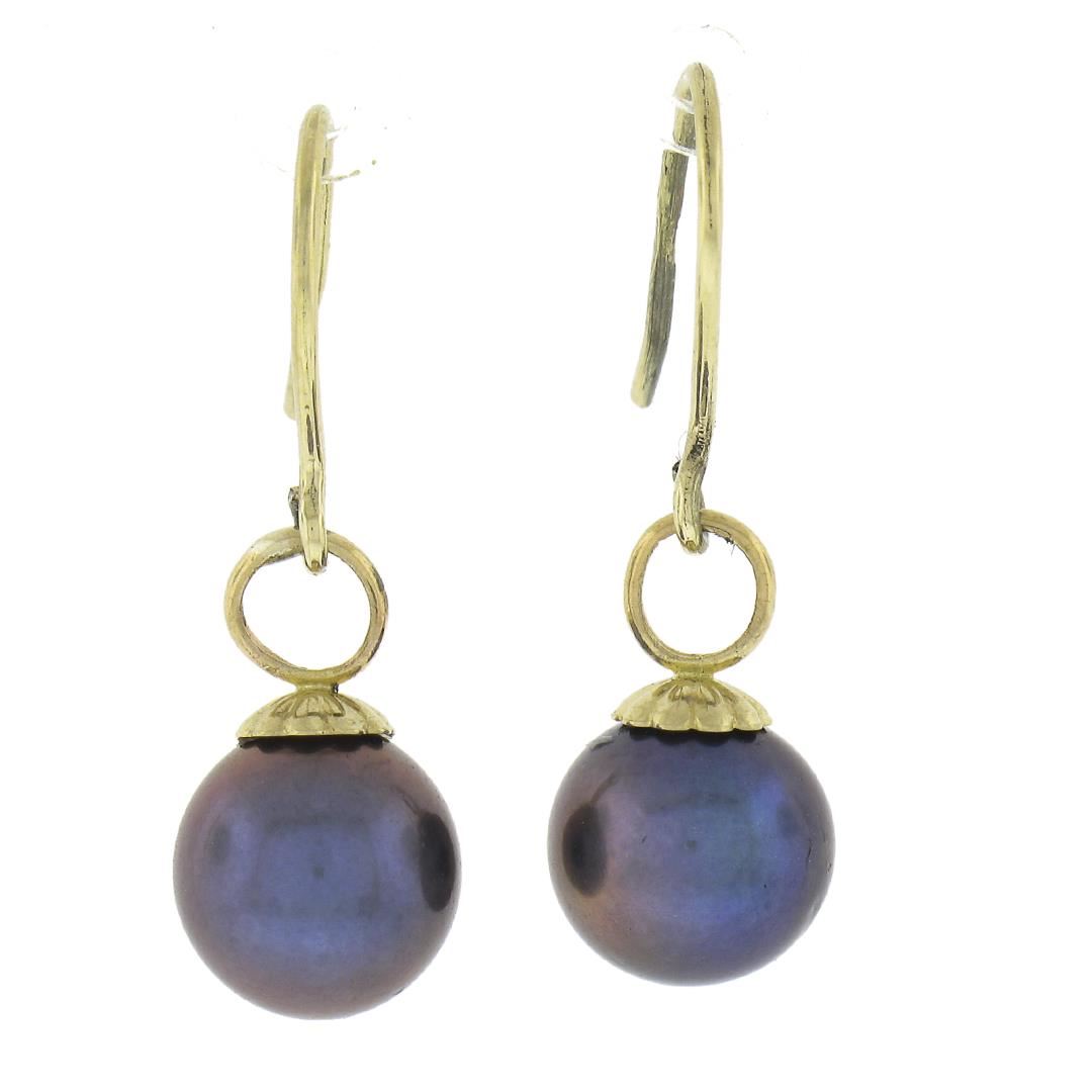 A solid 14k yellow gold dangle hook earrings, with 2 round tahitian pearls (8.3mm). The earrings measure approximately 25.6x8.3mm and weigh a total of 2.27 grams.