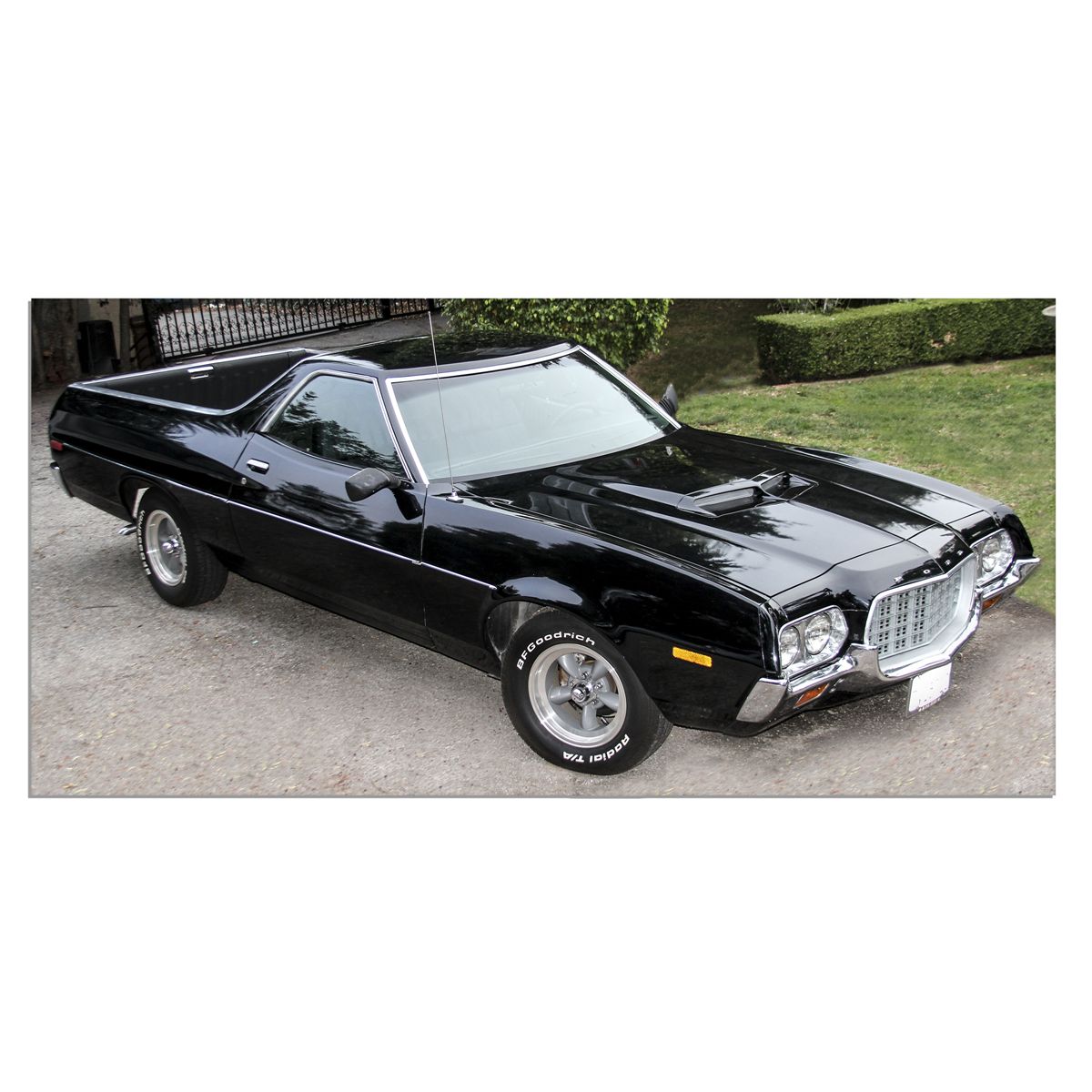 1972 Ford Ranchero 2-door coupe utility car. Classic automobile in glossy black features a period correct American racing ''torque thrust'' 302 motor and automatic transmission. From the sixth generation, with GT option hood and mirrors and new wheels and tires. The Ranchero design has a large fishmouth grille and dark green interior. Bed area is coated with Line X. With older, quality restoration that shows very well. Excellent overall daily driver condition with many new parts.