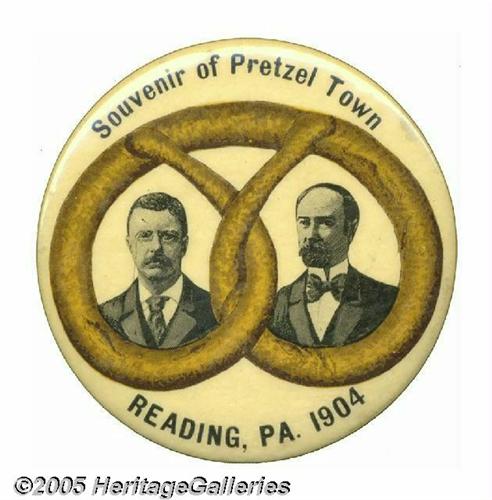 <B>Classic 2 1/8" Roosevelt - Fairbanks "Reading Pretzel" Rarity</B></I> One of the most desired jugate rarities: great design and subject combine with extreme rarity in this pin. This is only the second example we have handled, and the other was significantly foxed. We would be surprised if there are more than a half dozen examples in the hobby. Condition is basically beautiful. For strictest accuracy, we note a totally trivial small, very light edge stain mark at 1:30. Perfectly centered, and a wonderful Theodore Roosevelt piece! Lot:261