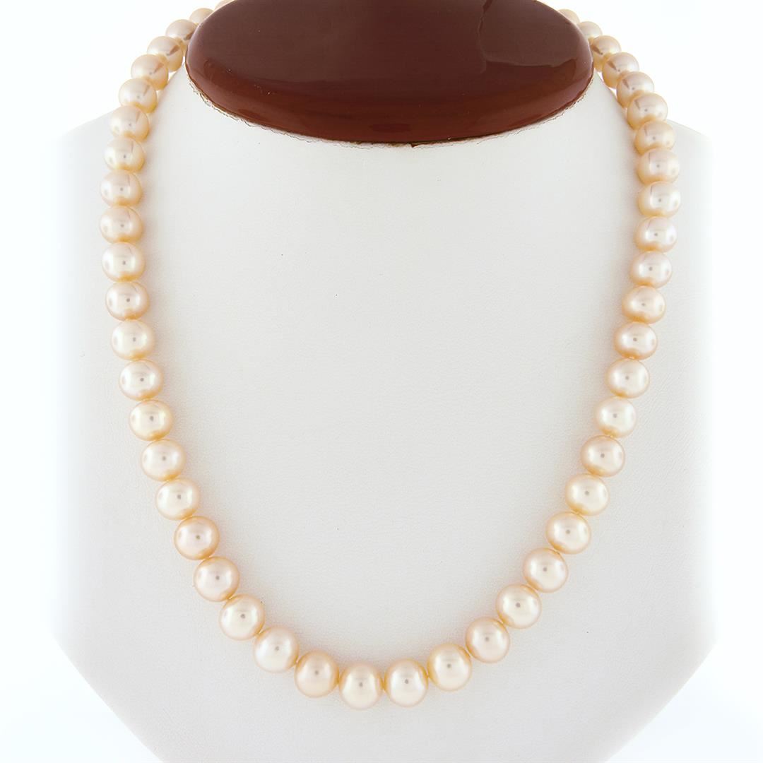 A strand necklace with 14k yellow gold clasp, with 54 round shape cultured pearls (8.0mm to 8.5mm each). 17.5 inch strand link chain, 40.69 grams total weight, clasp thickness measures 8.0mm.