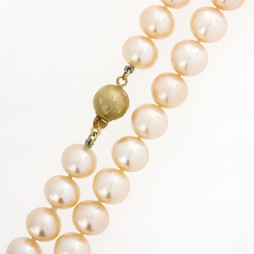 A strand necklace with 14k yellow gold clasp, with 54 round shape cultured pearls (8.0mm to 8.5mm each). 17.5 inch strand link chain, 40.69 grams total weight, clasp thickness measures 8.0mm.