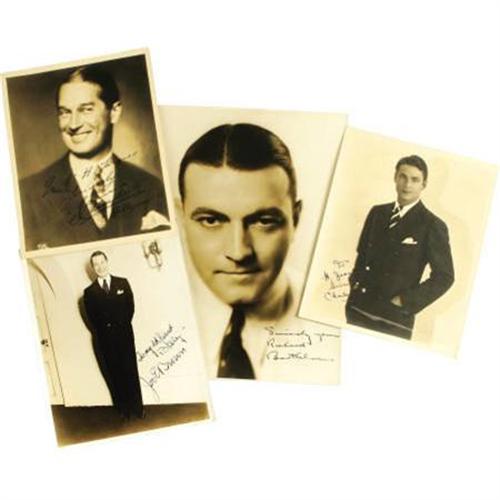 <B>Classic Actors Signed Photos, Set of Four.</B></I> Includes signed b&w 8" x 10" photos of Joe E. Brown, Maurice Chevalier, and Charles Farrell (secretarial), and a b&w 10.5" x 13.5" signed photo of Richard Barthelmess; plus a promo tabloid for the 1936 drama <I>The Man Behind the Mask.</B></I> In overall Very Fine condition with mild wear, toning, and creasing to the photos, and moderate wear and creasing to the promo book.<BR><BR><b>Shipping:</b> Flat Material, Small (<a target="_blank" href="http://www.heritageauctions.com/common/shipping.php">view shipping information</a>)