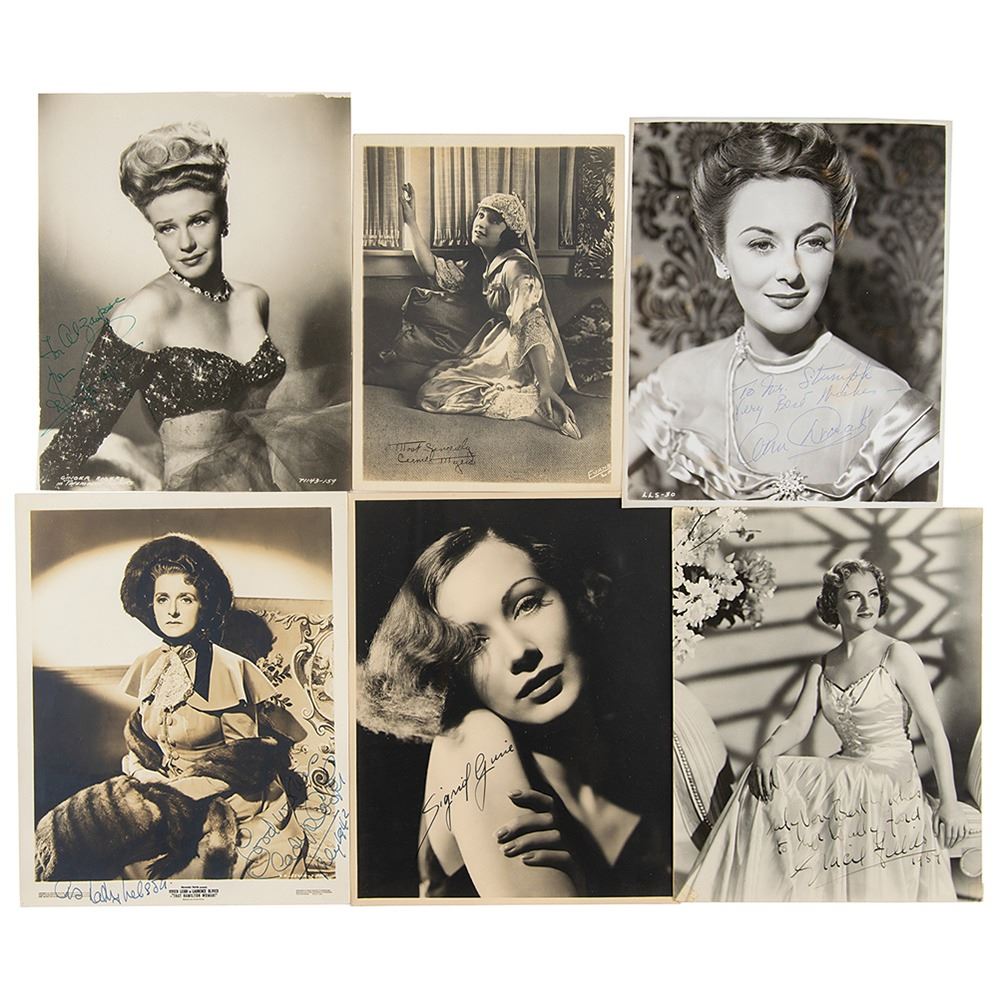 Six vintage photos of classic actresses, ranging in size from 6.5 x 8.5 to 8 x 10, each signed in fountain pen or ballpoint by the subject. Includes: Ginger Rogers (ins), Gracie Fields (ins), Gladys Cooper (ins), Carmel Myers, Sigrid Gurie, and Ann Dvorak (ins). In overall fine condition.