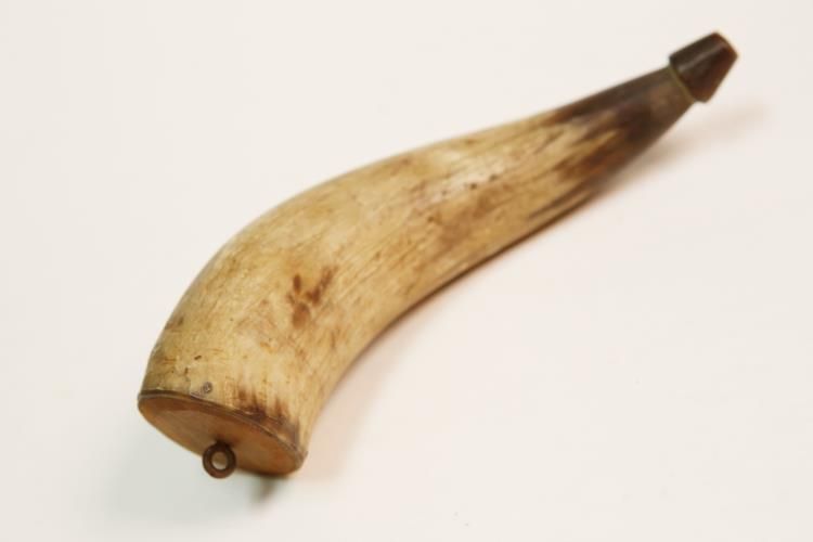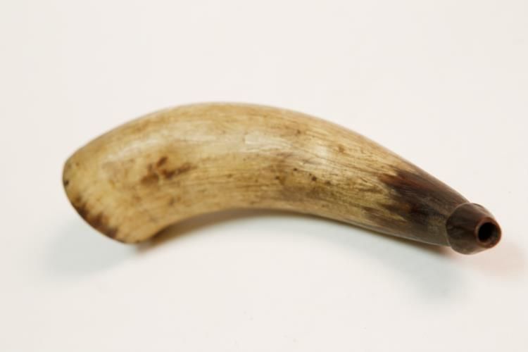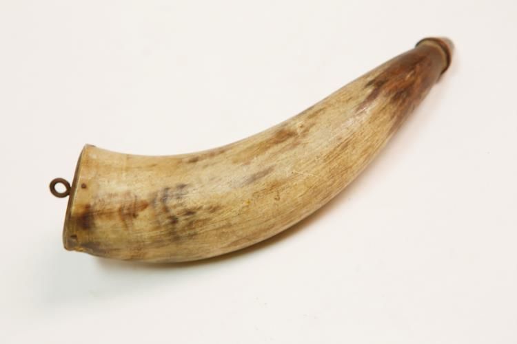This horn came out of Virginia in the late 1960's and has a very pleasing form to it with a nice patina overall. Nicely carved spout and the base plug has been attached with old square nails and it has a screw eye for attaching it's strap. No worm holes in this horn! The horn is 8.25" in length and the base has a diameter of 2.25".