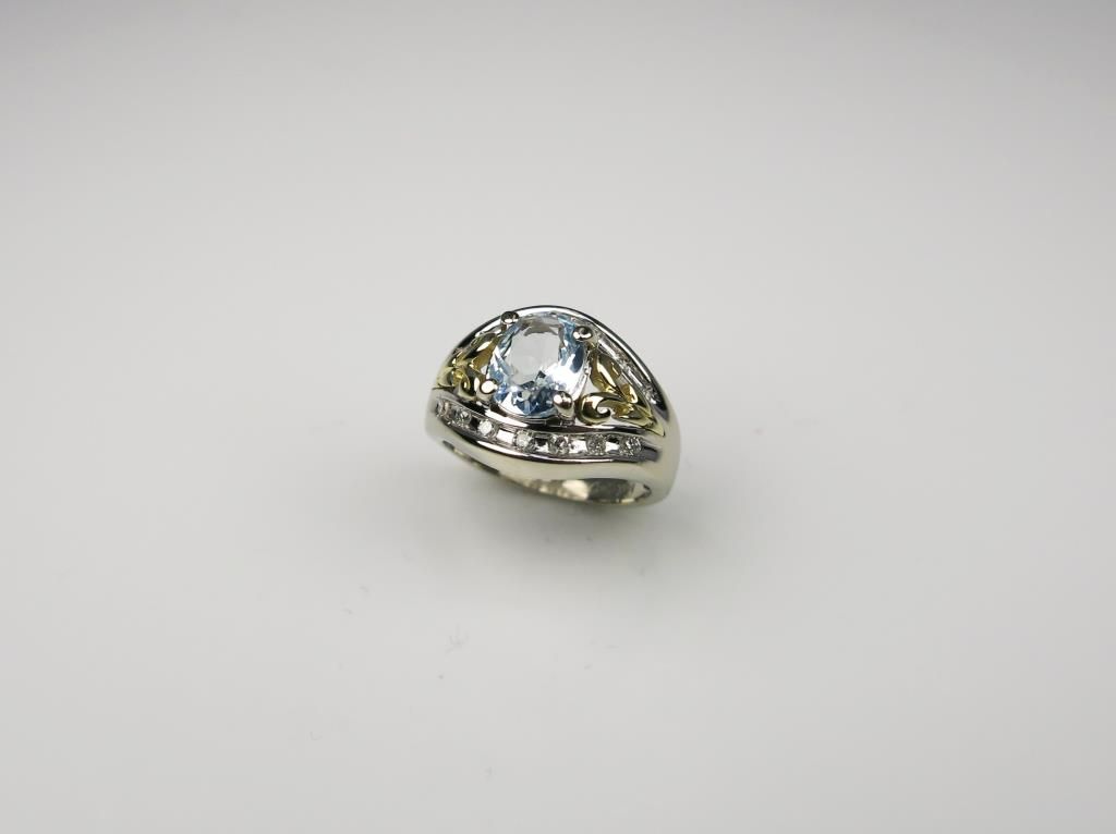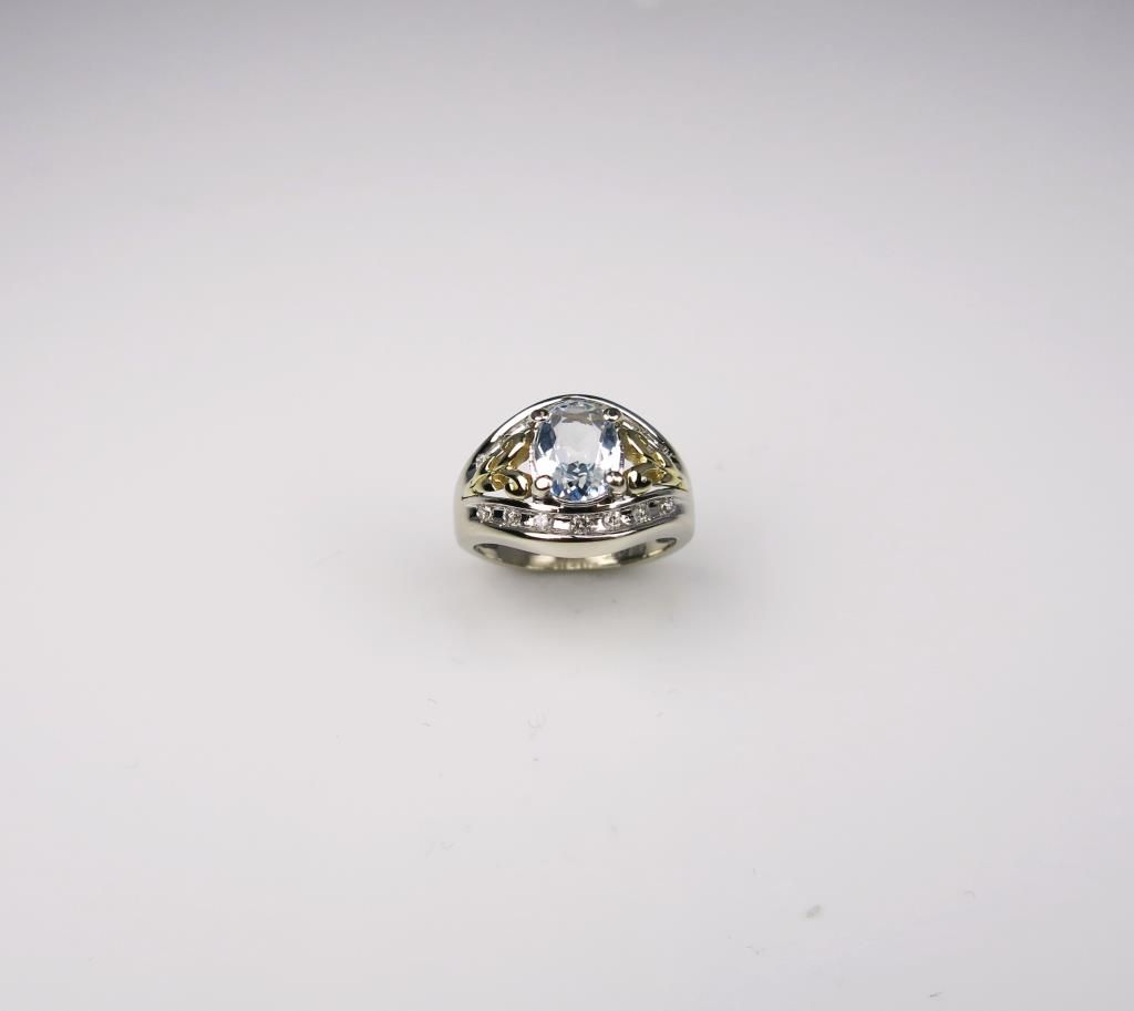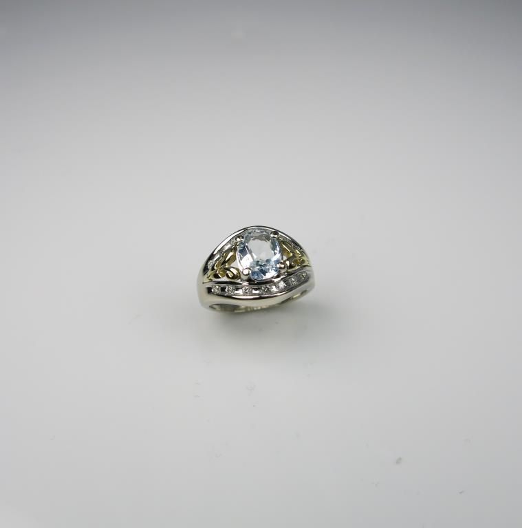 Classic Aquamarine and Diamond Ring with aquamarine weighing approx. 3.00 carats with 14 round diamonds weighing approx. 0.20 carats set in 14 karat two tone gold. Retail $1,200-$1,800 Estimate $800-$1,000