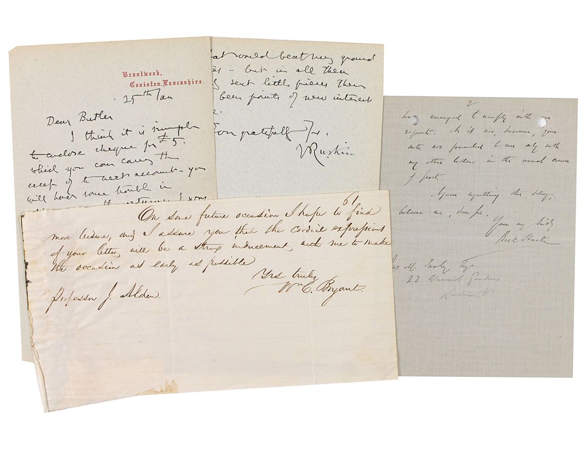 Three letters from William Cullen Bryant, Bret Harte, and John Ruskin: ALS signed “W. C. Bryant,” one lined page, 7.75 x 4, 1861; ALS signed “Bret Harte,” two pages on two adjoining sheets, 4.25 x 6, The Red House letterhead, February 3, 1901; and an ALS signed “J. Ruskin,” two pages,” 4.25 x 6.75, Brantwood letterhead, January 25, no year. In overall very good to fine condition.