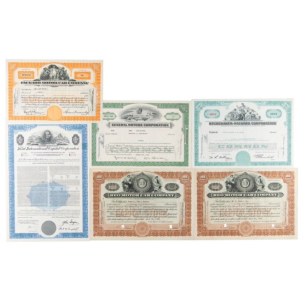 Appealing group of six multicolored stocks and bonds for notable early automobile companies, including: two REO Motor Car Company stock certificates for 100 shares, both dated 1925; a Packard Motor Company stock certificate for 50 shares, dated 1938; a Studebaker-Packard Corporation stock certificate for 100 shares, dated 1961; a General Motors Corporation stock certificate for 2 shares, dated 1967; and a Ford International Capital Corporation debenture of $1000, dated 1968. In overall fine condition. Accompanied by several prints of classic cars.