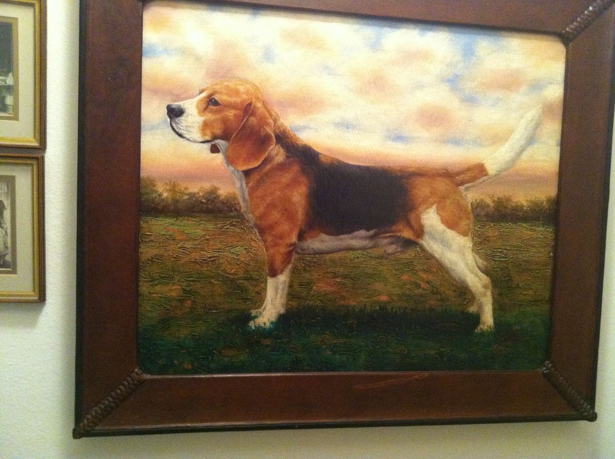 This is an original oil painting of your classic tri-colored pedigreed Beagle. Not your favorite Snoopy dog , but perhaps Snoopy’s esteemed Grandfather . Designed to look like a Centuries old crackled heirloom , this original painting of a magnificent and stately Beagle stud reminds us of the portraits that the Aristocracy often commissioned for their Country homes in the 18th and 19th Century Europe. It is framed in a handsome, hand-made leather molding manufactured in South America . There is one imperfection in the leather , which will be restored as best is possible. The frame measures _____x_____ and the image ______x____” .