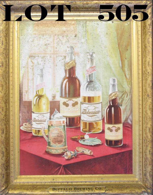 Classic Buffalo Brewing Co., Sacramento, Cal. advertiser on metal in shape of picture and frame, approx. 28-1/2” X 22-1/2” in overall fair to good condition showing an uncleaned display of Buffalo Brewing Co. product beerson a table by the window of a home; the lower 2/3’s of the advertiser is in good condition, the top third shows scattered spotting and erosion; the “frame” is overall good with areas of old erosion and loss; thehallmark Company name on the bottom of the “frame” is complete. A classic collectible from the Gold Country. Est.: $350-$650.