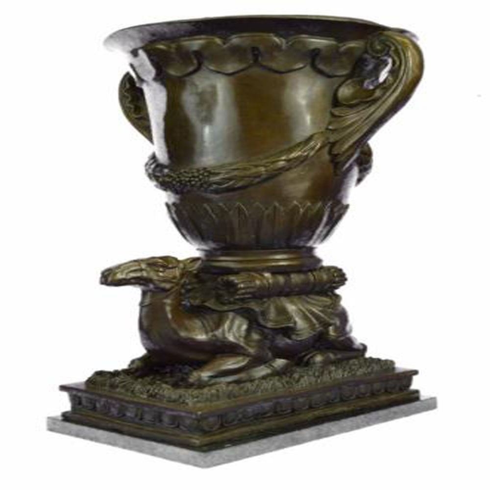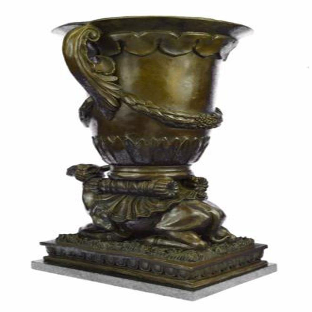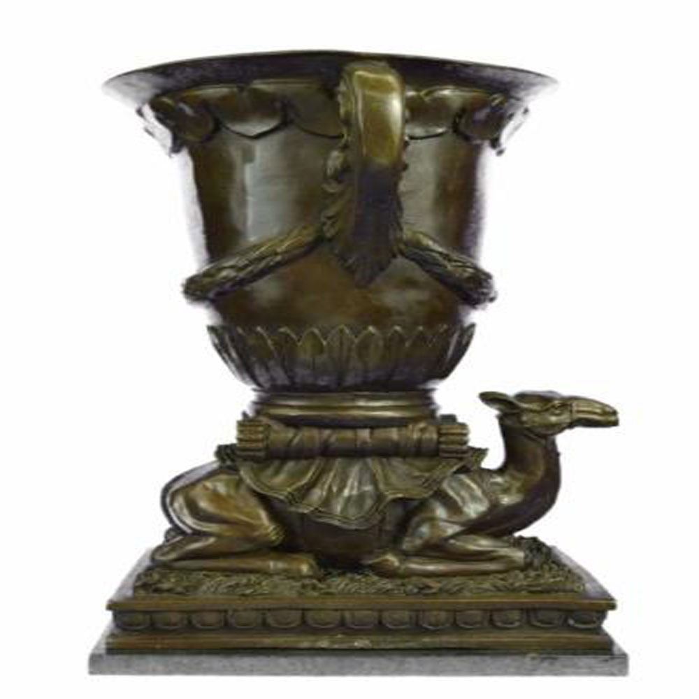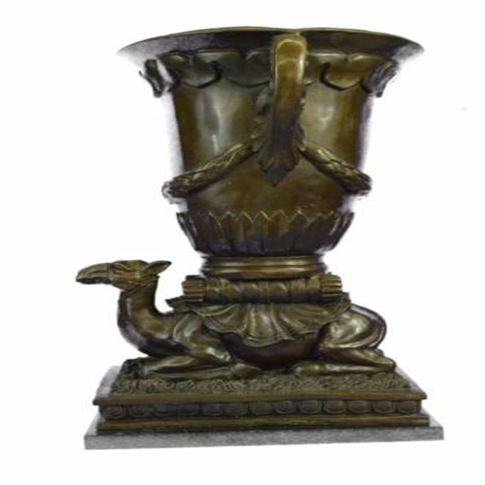 This is an interesting vase that seems to incorporate the essence of ancient beauty and wilderness. The body of the vase is fashioned into a mosaic as if pieces of tiles were placed. The body is supported by a decorated Camel. This work of art is both practical and an aesthetic addition to the house as a bouquet of blooming flowers can be seen beautifying the environment. The Bronze piece was cast using the archaic methods of lost wax casting and stained with a brown patina finish. It is positioned upon a marble base. Bronze Dimensions with Marble Base: Height 20 X Width 13 inches. Weight: 37 LBS.