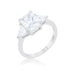 A pair of clear trillion cut stones accompany a clear radiant cut center stone in this elegant 4.5ct CZ engagement ring. A modern twist on a classic piece. Our genuine rhodium finish is achieved using an electroplating process that coats the item with heavy layers of rhodium a close cousin to platinum. This gives our jewelry a platinum luster.Base Metal: Lead Free Alloy (Brass)Style: , Setting Type: ProngsMaterials: , Stone Cut: Trillion| RadiantCarat Weight: 4.5ctColor: , Plating Color: SilvertoneChain Clasp: 6.00Ring Band Width: 2.2mmBracelet Size: 21 mm L x 9 mm W x 6.5 mm HStone Size: 9mm| 5mmType: Ring