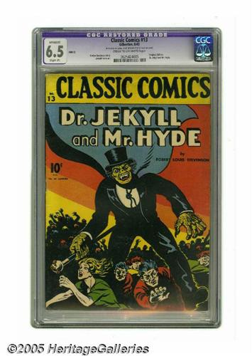 <B>Classic Comics #13 Dr. Jekyll and Mr. Hyde (Gilberton, 1943) CGC Apparent FN+ 6.5 Slight (P) Cream to off-white pages.</B></I> Original edition (HRN 12). CGC notes, "small amount of color touch on cover." Overstreet 2005 GD 2.0 value = $123; VG 4.0 value = $246; FN 6.0 value = $369.