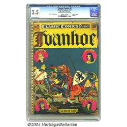 <B>Classic Comics #2 Ivanhoe - First Edition (Gilberton, 1941) CGC GD+ 2.5 Cream to off-white pages.</B></I> Original Edition. Malcolm Kildale cover. CGC notes, "One piece of tape on interior cover." Overstreet 2004 GD 2.0 value = $224. <BR><BR><B>Important notice:</B> Heritage usually auctions material at the rate of 200-250 lots per hour. On some occasions eBay Live bid software or the Internet may not be able to keep up with the pace of the auction. We recommend placing a realistic absentee bid now as insurance to avoid disappointment. Occasionally the auctioneer may eliminate or reject an eBay Live bid, and the auctioneer may also reopen a lot after the close of the eBay live bidding (usually because we missed an audience bid), and may reject your bid even if it shows you as the winning bidder. By bidding via eBay Live, you agree that Heritage may award the lot to another bidder at its sole discretion under the circumstances described above or any other reasonable circumstances. Since eBay bids are not shown to us until we open the lot on the floor, we treat those bids just like floor bids. In most cases the floor responds before the eBay bid is presented to us, due to Internet lag time, so for consistency we have made it a policy that floor bids are always considered first over tie eBay live bids. Also please note that all Heritage lots purchased through eBay Live carry a 20% Buyer's Premium. Please make sure you read the Terms and Conditions before you bid. </span></font></tr></table></td></tr></table>