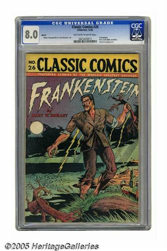 <B>Classic Comics #26 Frankenstein - HRN 30 (Gilberton, 1945) CGC VF 8.0 Off-white to white pages.</B></I> Variant with blank price circle on cover and no indicia. Female hanging panel. Overstreet 2005 VF 8.0 value = $175. CGC census 7/05: 1 in 8.0, none higher.