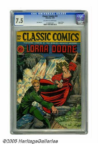 <B>Classic Comics #32 Lorna Doone - Original Edition (Gilberton, 1946) CGC VF- 7.5 Off-white to white pages.</B></I> Matt Baker art. Overstreet 2005 VF 8.0 value = $235. CGC census 7/05: 1 in 7.5, 1 higher.