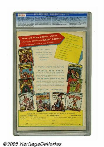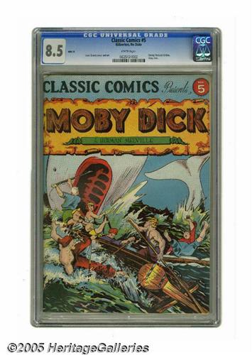 <B>Classic Comics #5 Moby Dick (Gilberton, 1943) CGC VF+ 8.5 White pages.</B></I> HRN 10. Conray Products edition. Overstreet 2005 VF 8.0 value = $170; VF/NM 9.0 value = $245. CGC census 2/05: 1 in 8.5, none higher.