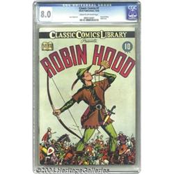 <B>Classic Comics #7 Robin Hood - First Edition (Gilberton, 1942) CGC VF 8.0 Cream to off-white pages.</B></I> Original Edition. Louis Zansky art. This is one of several early, original editions of <B>Classic Comics</B></I> that Heritage is proud to be offering. Overstreet 2004 VF 8.0 value = $531. <BR><BR><B>Important notice:</B> Heritage usually auctions material at the rate of 200-250 lots per hour. On some occasions eBay Live bid software or the Internet may not be able to keep up with the pace of the auction. We recommend placing a realistic absentee bid now as insurance to avoid disappointment. Occasionally the auctioneer may eliminate or reject an eBay Live bid, and the auctioneer may also reopen a lot after the close of the eBay live bidding (usually because we missed an audience bid), and may reject your bid even if it shows you as the winning bidder. By bidding via eBay Live, you agree that Heritage may award the lot to another bidder at its sole discretion under the circumstances described above or any other reasonable circumstances. Since eBay bids are not shown to us until we open the lot on the floor, we treat those bids just like floor bids. In most cases the floor responds before the eBay bid is presented to us, due to Internet lag time, so for consistency we have made it a policy that floor bids are always considered first over tie eBay live bids. Also please note that all Heritage lots purchased through eBay Live carry a 20% Buyer's Premium. Please make sure you read the Terms and Conditions before you bid. </span></font></tr></table></td></tr></table>