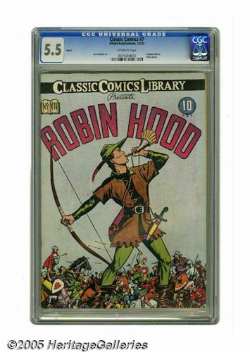 <B>Classic Comics #7 Robin Hood (Gilberton, 1942) CGC FN- 5.5 Off-white pages.</B></I> Original edition (HRN 6). Overstreet 2005 FN 6.0 value = $261. CGC census 2/05: 1 in 5.5, 1 higher.