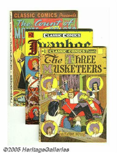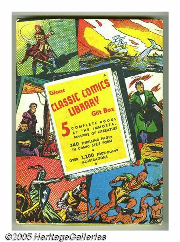 <B>Classic Comics Library Gift Box (Gilberton, circa 1943) Condition: Average FN/VF.</B></I> Rare to find this complete set of second editions of the first five issues of <B>Classic Comics</B></I> in this special "Classic Comics Library Gift Box" format. The issues include #1 (<B>The Three Musketeers</B></I>), #2 (<B>Ivanhoe</B></I>), #3 (<B>The Count of Monte Cristo</B></I>), #4 (<B>The Last of the Mohicans</B></I>), and #5 (<B>Moby Dick</B></I>), with an average condition of FN/VF. The colorful, attractive box grades about VG+. Approximate Overstreet value for comics = $650. <I>From the collection of Chris Bell</B></I>.