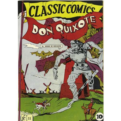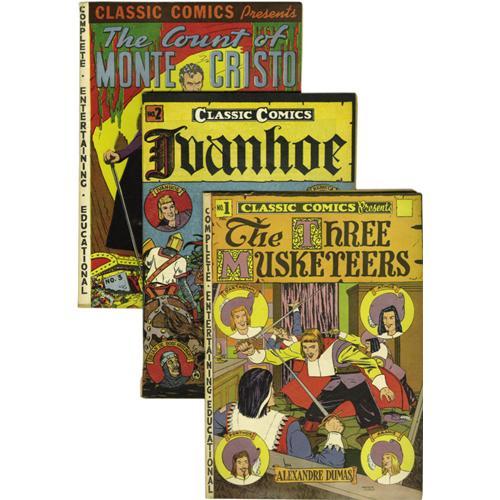 <B>Classic Comics and Classics Illustrated Group (Elliot and Gilberton, 1943-46).</B></I> An Original Edition of #11 ("Don Quixote"; FN-, appears VF- but has a two-inch spine split at the bottom) is the highlight of this group of <B>Classics</B></I>. Also included here are <I>Original Editions</B></I> of #35 ("The Last Days of Pompeii"; FN) and #36 ("Typee"; FR/GD); <I>HRN 10</B></I> printings of #1 ("The Three Musketeers"; FN); #2 ("Ivanhoe"; Qualified VF with detached centerfold); #3 ("The Count of Monte Cristo"); and #5 ("Moby Dick"); the <I>HRN 12</B></I> printing of #4 (VG, manufactured without a staple); the <I>HRN 15</B></I> printings of #12 ("Rip Van Winkle and the Headless Horseman") and #13 ("Dr. Jekyll and Mr. Hyde," considered the first horror comic; used in <B>Seduction of the Innocent</B></I>); <I>HRN 28</B></I> printings of #1 (GD), #2 (VG/FN), #5 (GD), #9 ("Les Miserables," GD), #10 ("Robinson Crusoe," used in <B>Seduction of the Innocent</B></I>; GD/VG); #11 (VG), #12 (VG+), #13 (VG+), #14 ("Westward Ho"; VG), #15 ("Uncle Tom's Cabin," GD); #16 ("Gulliver's Travels"; FN), #18 ("The Hunchback of Notre Dame," FN); and #20 ('The Corsican Brothers," VG+); and the <I>HRN 30</B></I> printings of #21 ("3 Famous Mysteries," FR) and #22 ("The Pathfinder; FR/GD). Approximate Overstreet value for group = $1,500.