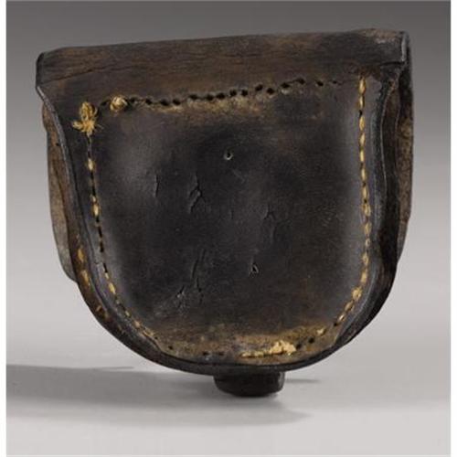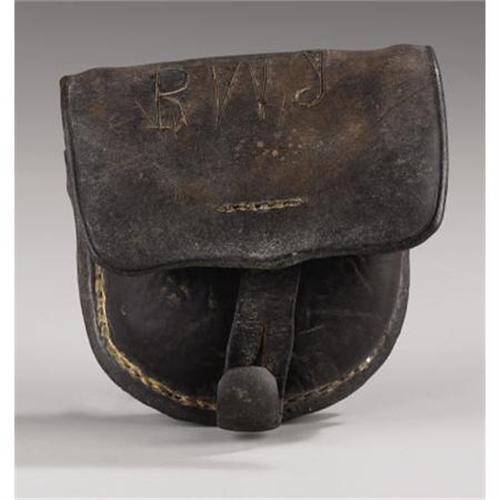 <B>Classic Confederate Manufactured Lead Finial Cap Box.</B></I> Possibly an early battlefield recovery with initials āR W Jā deeply carved on the front flap. Loaded with character as quintessentially Confederate as any cap box you will ever see.<BR><B>Condition:</B></I> Overall very dry and stiff with the stitching popped and the box now actually in four pieces. Square cut front flap, which seems to have been preferred by Confederate manufacturers. Very long latch tab, 3/8ā diameter squat rounded lead finial. The original wide single belt loop is missing but the stitching/holes for it are present. The end panels on the inside flap are also missing. Remarkably the finish on the leather is excellent with no cracking or flaking. <BR><BR><BR><b>Shipping:</b> Miscellaneous Collectibles, Smal (<a target="_blank" href="http://www.heritageauctions.com/common/shipping.php">view shipping information</a>)