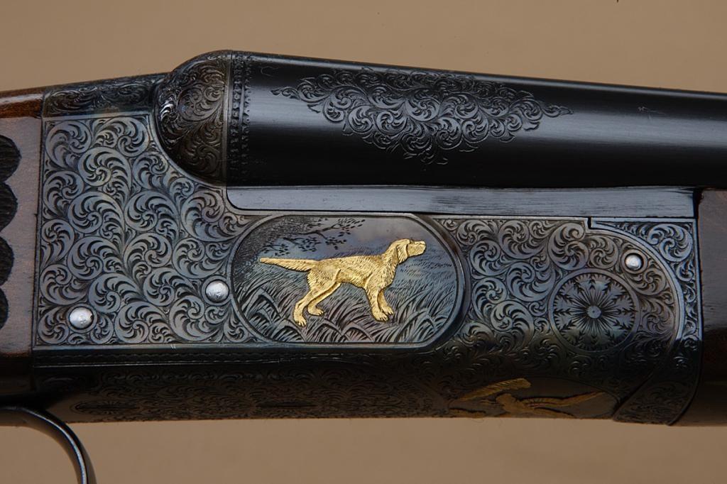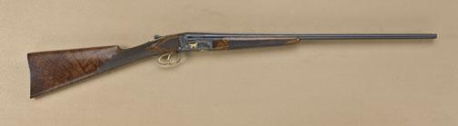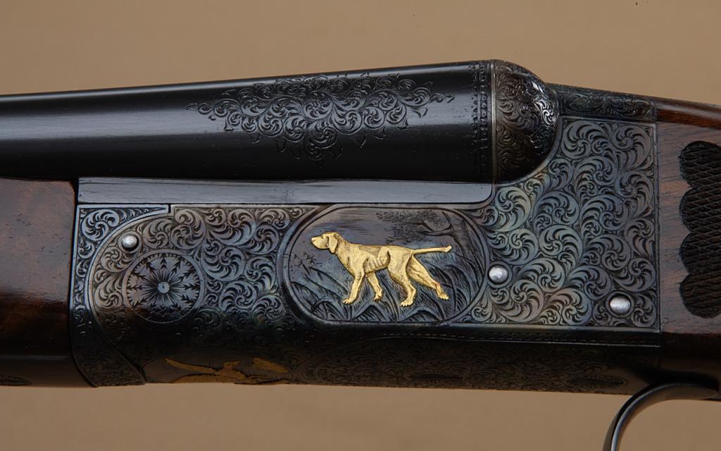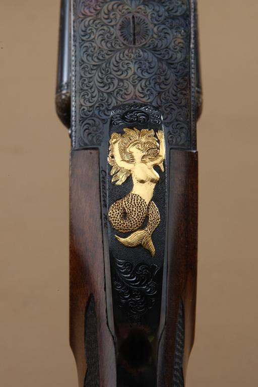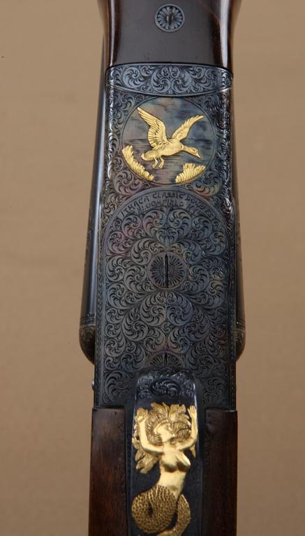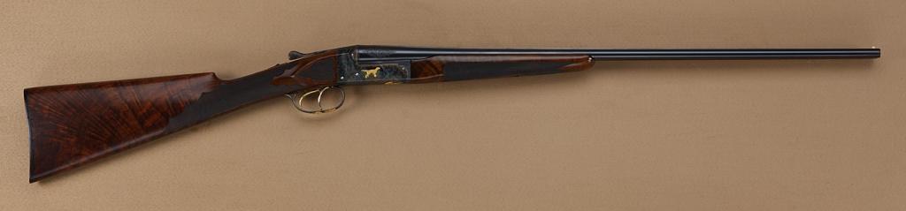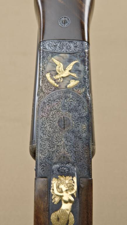 Classic Doubles side by side 410ga shotgun on Ithaca design, simulating highest grade with gold mermaid on triggerguard, relief gold inlays of dogs on each side of action, landing duck on bottom of frame surrounded by scroll with logo on bottom of frame, Ithaca Classic Doubles, Bloomfield, New York. The gun is marked EXP on triggerguard and serial #44786 on frame and barrels. The barrels measure slightly over 26” and are choked“Modified” (right) and “Full” (left). Blue and case hardened finish, English style straight pistol grip, fancy checkered select walnut stock with select burl wood grain, double triggers, auto ejectors. Stockmeasures 14-5/8” to the end of the wood, 14-7/8” to the end of the hard-rubber recoil pad. The gun is in fine to excellent original condition and the gun shows Italian proof marks from where it was made. As ourinformation has it, this company is out of business and imported a good quality gun for a short period. An interesting high-grade 410. From the Robert Petersen collection. Est: $2,000 - $4,000