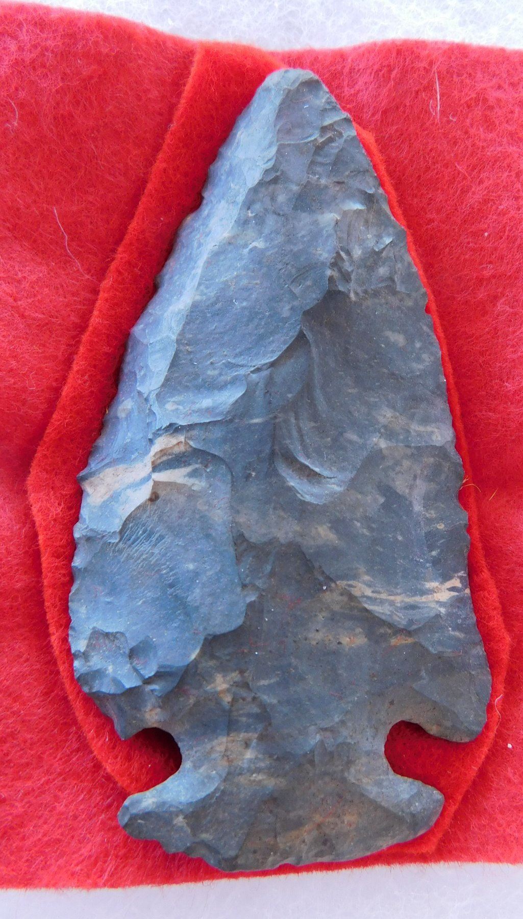 Classic Dovetail Point w/Helm COA, pre-historic item. Made of black chert, the item measures 3 1/4". Scioto County, Ohio. Helm Certificate of Authenticity. Condition: Barb ding, see images. Shipping: $14.50 w/insurance and signature.