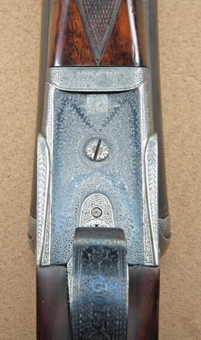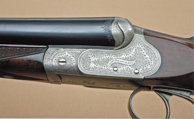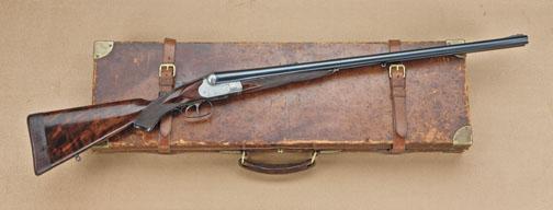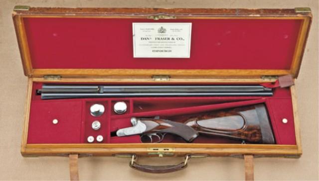 Classic English big-bore double rifle in .577 express by Daniel Fraser and Co. of Edinburgh, Scotland. The rifle measures approx. 44-1/4” overall with 28” barrel. The rifle shows two-leaf folding rear sight and removable front sight. The action is nicely scalloped and engraved in bank-note motif. The gun is stocked in figured walnut, nicely checkered. The rifle shows automatic ejectors, and an English leather recoil type pad with horned forend cap and slings for European swivels. The rifle is numbered 3015 on the triggerguard and shows an excellent quality refurbish with 98% blue on barrels, triggerguard, and bottom of action. Sides of action lightly polished to grey and shows double safety mechanism on tang and Fraser’s patent on lever. The action is tight, the bores are very good. The gun is contained with its original to the period oak case with brass furniture showing Fraser trade label in lid. With nickel plated accessories, snap caps, sling swivels, and other small accessories. The case is in good condition with some scuffs, small losses at the edges, normal aging. Est: $20,000 - $40,000