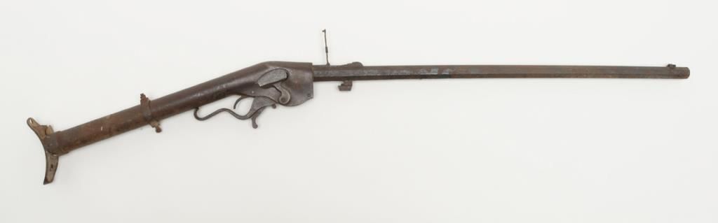 Classic Evans lever action Sporting rifle in relic condition, .44 Evans cal., 26” octagon barrel, missing stock and forend; would make a great wallhanger for the gunroom, den or man cave. (Antique). Est.: $200-$400.