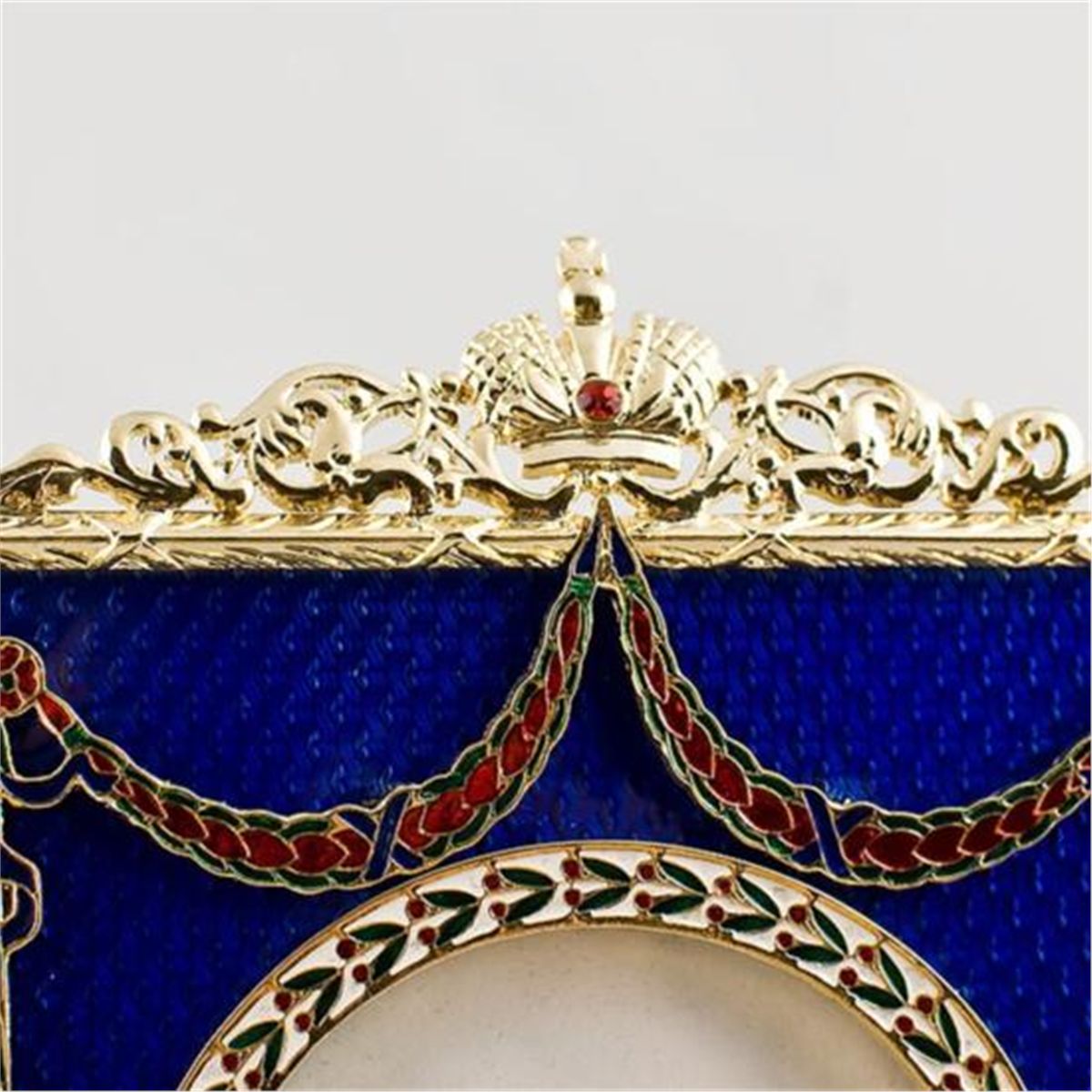 Classic Faberge Picture Frame, The Faberge picture frame is in a royal blue guilloche enamel with golden mounted edges. The top of the photo frame is ornamented with a colorful garland falling around the sides of the circular frame. On the bottom two corners there are two flower branches enriched with small crystals. Dimensions: 5in (D), Photo Insert Size: 2.25in (D), Material: Pewter, Enamel, Crystals.