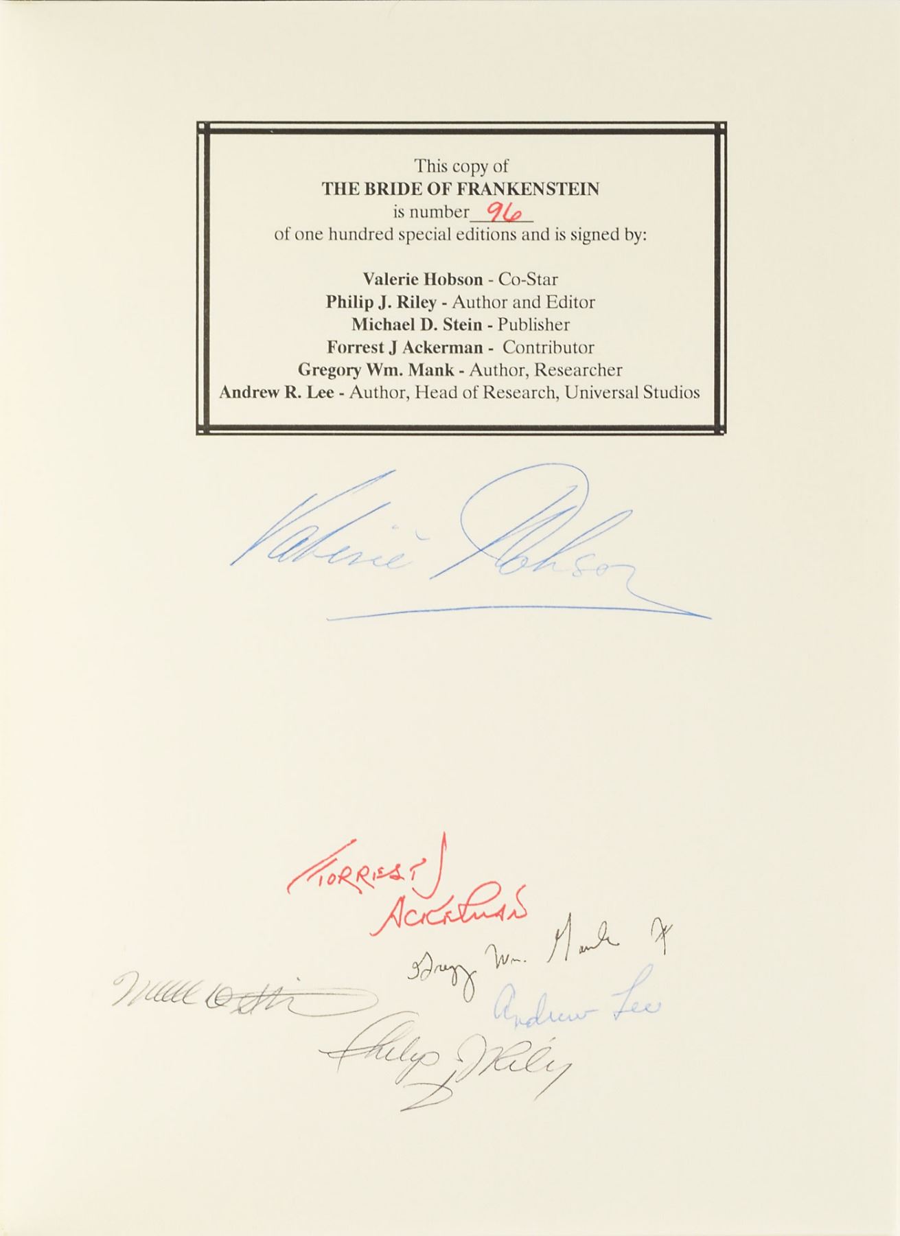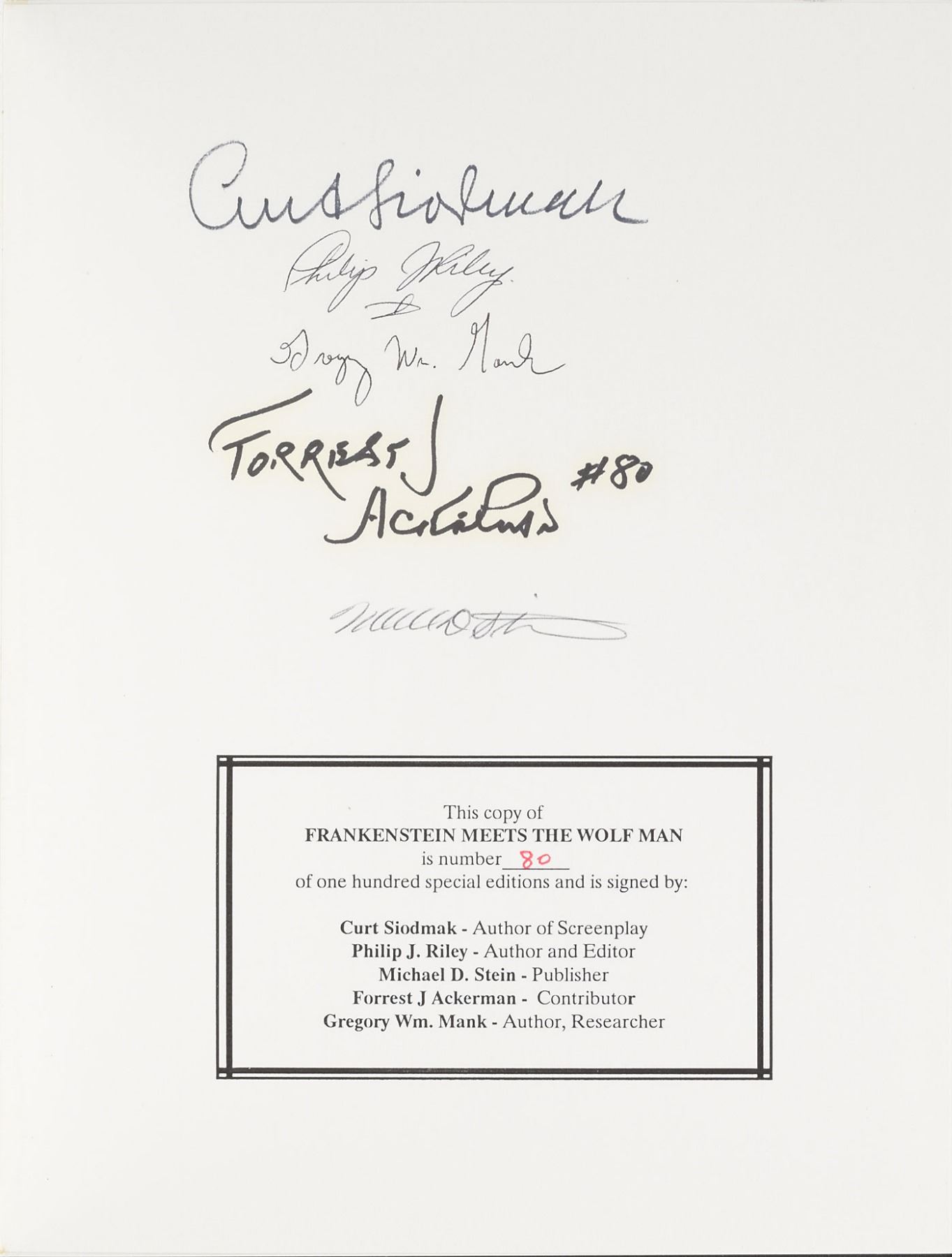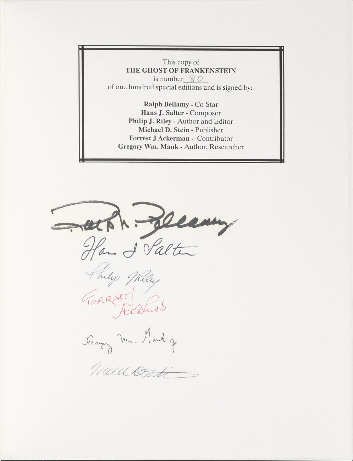Group of six limited edition books by MagicImage Filmbooks honoring famous Universal Pictures monster movies, all hardcover, 8.75 x 11.25, each signed on the colophon in various ink types by several affiliated with the film or publication, including: The Bride of Frankenstein, Vol. 2, 96/100, signed by Valerie Hobson, Forrest J. Ackerman, and four others; The Ghost of Frankenstein, Vol. 4, 80/100, signed by Ralph Bellamy, Hans Salter, Forrest J. Ackerman, and three others; Frankenstein Meets the Wolf Man, Vol. 5, 80/100, signed by Curt Siodmak, Forrest J. Ackerman, and three others; House of Frankenstein, Vol. 6, 81/100, signed by Peter Coe, Curt Siodmak, Forrest J. Ackerman, and three others; The Wolf Man, Vol. 12, 81/100, signed by Ralph Bellamy, Hans Salter, Curt Siodmak, and four others; and Dracula, Vol. 13, 61/100, signed by Bela Lugosi, Jr., Carla Laemmle, Ivan Butler, and three others. In overall fine condition.
