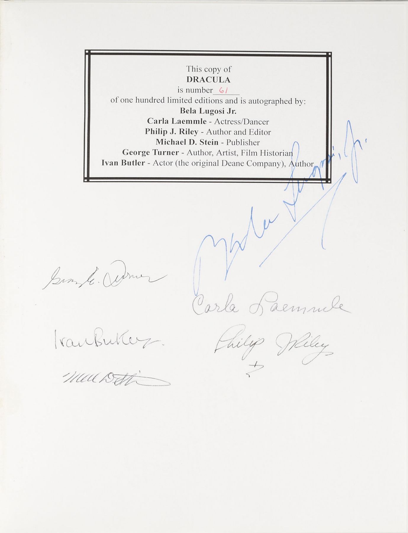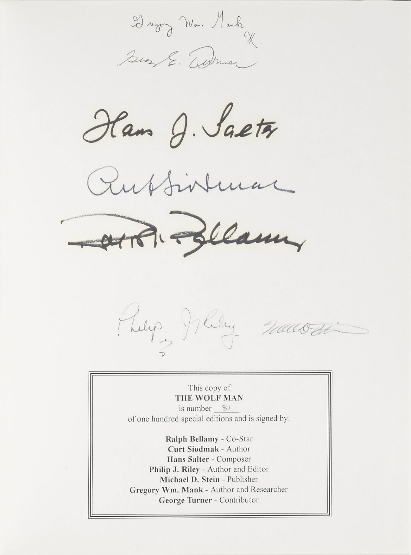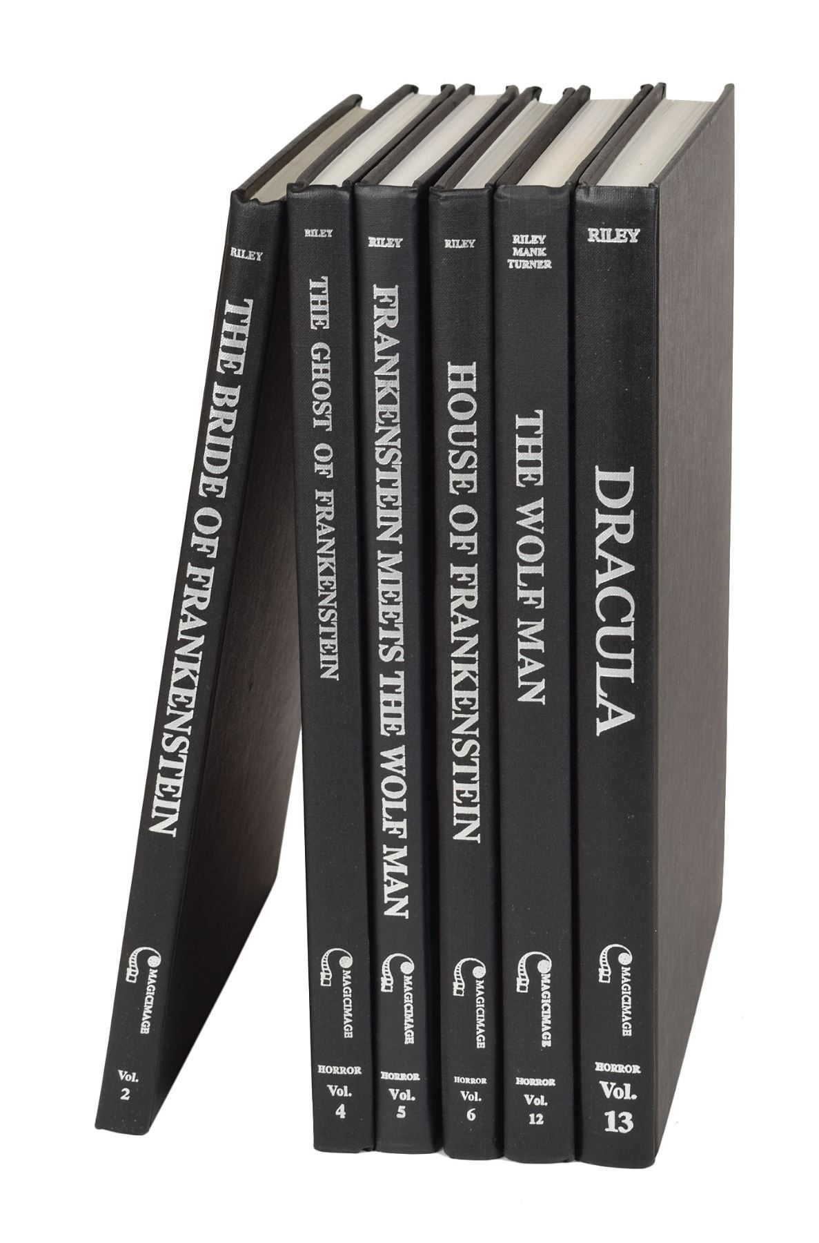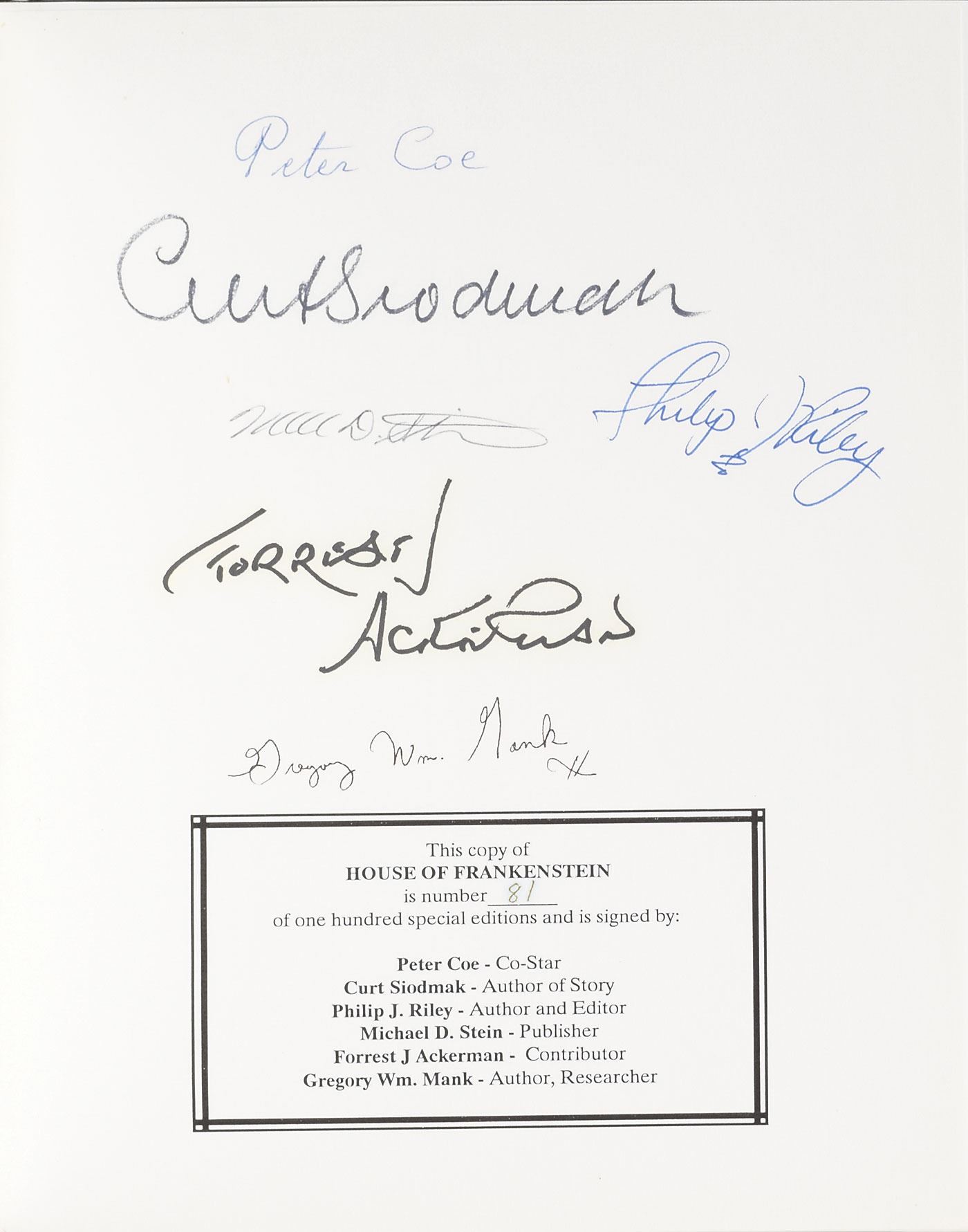 Group of six limited edition books by MagicImage Filmbooks honoring famous Universal Pictures monster movies, all hardcover, 8.75 x 11.25, each signed on the colophon in various ink types by several affiliated with the film or publication, including: The Bride of Frankenstein, Vol. 2, 96/100, signed by Valerie Hobson, Forrest J. Ackerman, and four others; The Ghost of Frankenstein, Vol. 4, 80/100, signed by Ralph Bellamy, Hans Salter, Forrest J. Ackerman, and three others; Frankenstein Meets the Wolf Man, Vol. 5, 80/100, signed by Curt Siodmak, Forrest J. Ackerman, and three others; House of Frankenstein, Vol. 6, 81/100, signed by Peter Coe, Curt Siodmak, Forrest J. Ackerman, and three others; The Wolf Man, Vol. 12, 81/100, signed by Ralph Bellamy, Hans Salter, Curt Siodmak, and four others; and Dracula, Vol. 13, 61/100, signed by Bela Lugosi, Jr., Carla Laemmle, Ivan Butler, and three others. In overall fine condition.