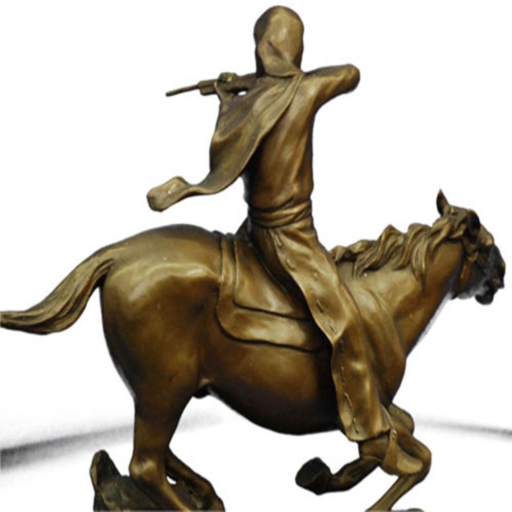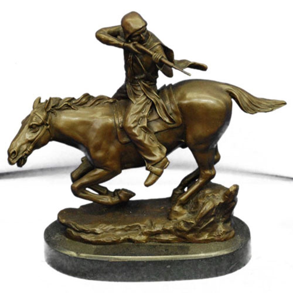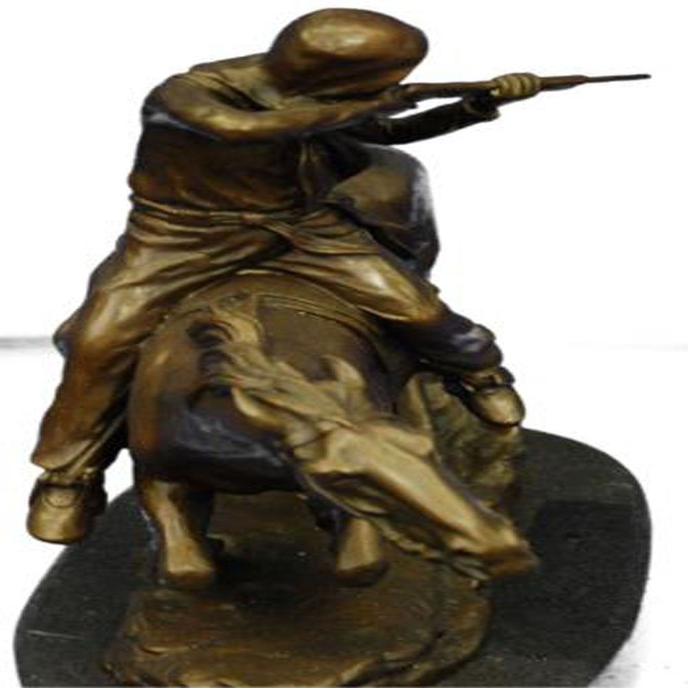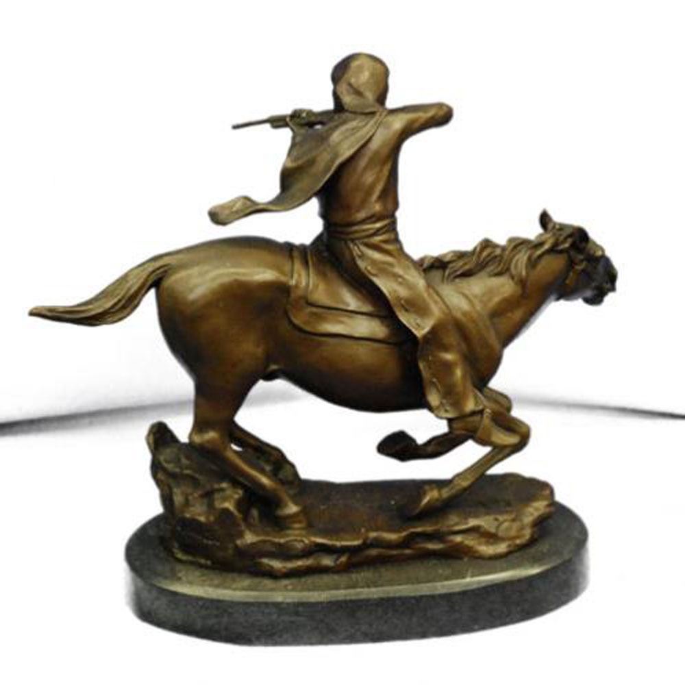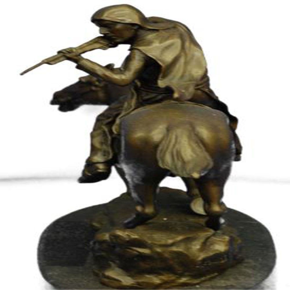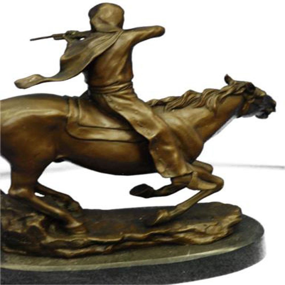 This is mounted Indian warrior Bronze Sculpture. The sculpture is finished with a classic patina in tones of browns and black that enhances the beauty of the horse and the rocky landscape upon which it proudly stands and is Mounted onto a marble base. Bronze Dimensions with Marble Base: Height 13 X Width 14 inches. Weight: 18 LBS.