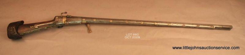 Classic Indian matchlock musket with Damascus barrel, brass decorations and tacks with butt extension in good condition. Circa 18th to 19th century. Est. $300 - $600