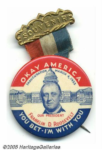<B>Classic Large 2 1/8" "Okay America" Franklin Roosevelt Button</B></I> This distinctive design was created to celebrate FDR's first inauguration in 1933, and has always been a collector favorite. Quite scarce, and in great condition. Lot:263