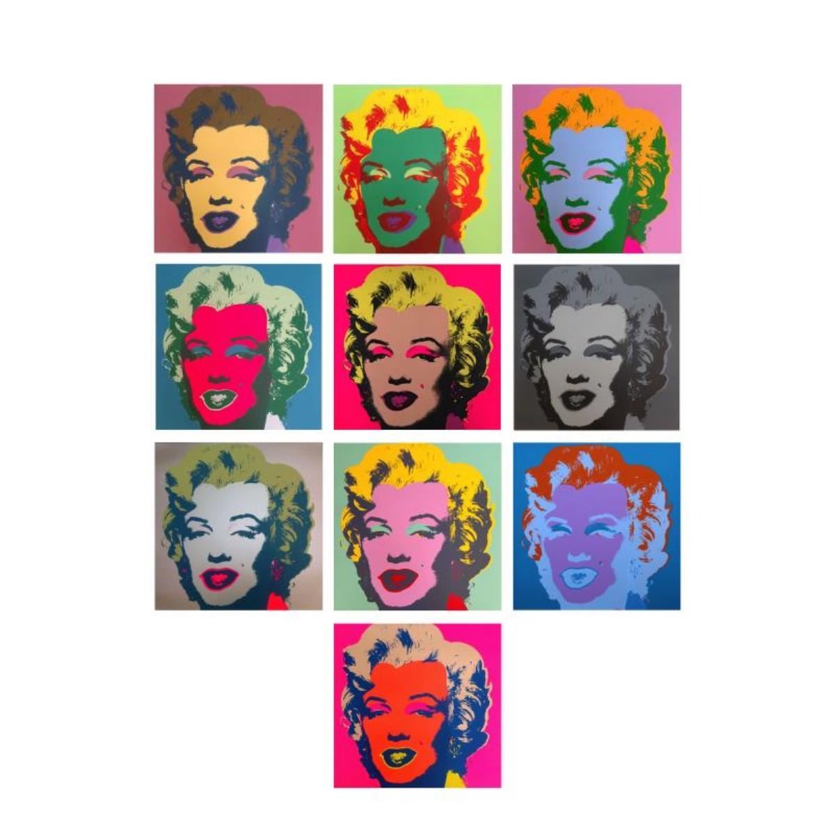 Classic Marilyn Portfolio by Warhol, Andy. "Classic Marilyn Portfolio" is a suite of 10 silk screen prints on paper (open edition) from Sunday B Morning featuring the works of Andy Warhol. The piece is stamped in blue on the back with "Published by Sunday B. Morning" and "fill in your own signature" and is accompanied by a certificate of authenticity. Measures approximately 36" x 36" (each).