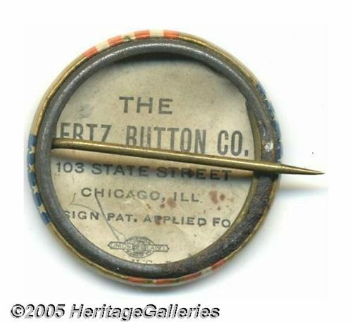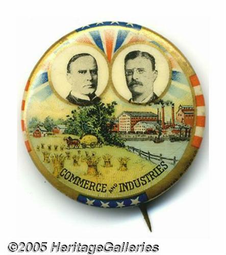 <B>Classic McKinley and Roosevelt Commerce and Industries Button</B></I> This classic 1 1/4" celluloid jugate shows William McKinley and Theodore Roosevelt pictured above a prosperous agricultural and industrial scene labeled "Commerce and Industries." It retains its original Hertz Button Company back paper. (Stick yourself with this button and it hertz!) This is a clean example, well-centered, with no serious defects. Lot:260