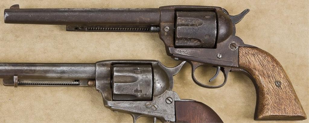 Classic Mexican copy of a Colt SAA revolver, .45 cal., 7-1/4” barrel, brown finish, smooth hard wood grips, #392. This gun shows an even heavy dark patina on metal surfaces and has approx. 10% nickel finish confined primarily to the top of the barrel; there are areas of moderate pitting on the cylinder and the ejector rod housing, the action needs repair and the grips are fair + and not fitting entirely to the straps. A great looking 19th century SAA copy from south of the border that probably has a great story to tell. Est.: $300-$600.