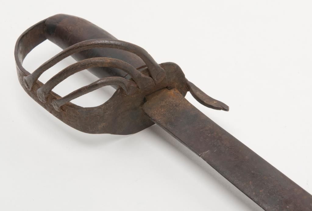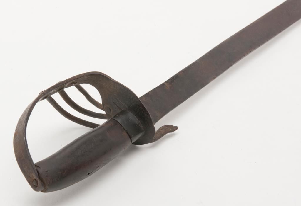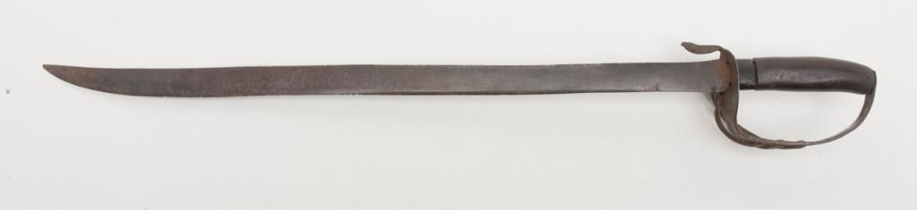 Classic Mexican short sword with forged iron three branch guard showing dark patina with some minor pitting and erosion with faint traces of engraving and markings on the blade that are not legible. The sword measures 30 ½” overall with a 25 ½”blade. This type sword would date between 1830-1890 in our opinion. Est.: $100-$300