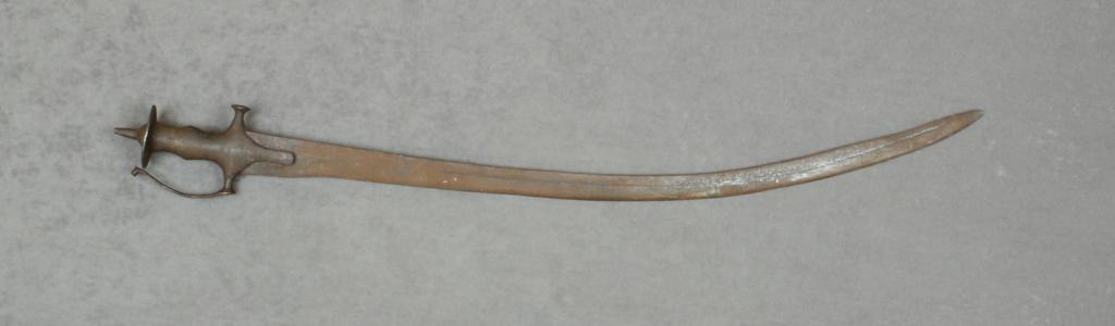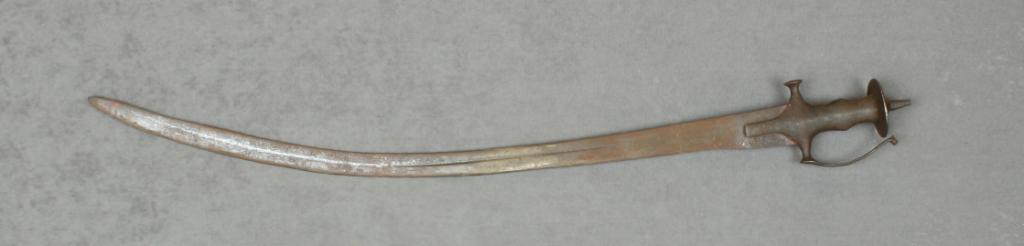 Classic Mid-eastern Tulwar curved blade sword, approx. 35” overall in uncleaned fair condition showing a heavy dark patina with unusual extension to one side of the integrated cross guard. Est.: $150-$300.