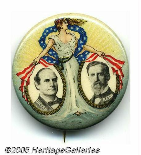 <B>Classic "Miss Liberty" Jugate Design for the 1908 Bryan and Kern Ticket</B></I> Our comments on the Taft and Sherman mate, offered elsewhere in this catalog, apply equally to this 1 1/4" beauty. Bryan and Kern jugates are on the whole more valuable than those from the 1896 and 1900 campaigns. Choice condition but for soiling of the back paper. Lot:260