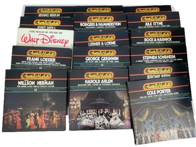 A collection of 16 boxed sets from American musicals. The list includes the Music Man, Hello Dottie and Mame, Guys and Dolls, The Most Happy Fella, and How to Succeed in Business Without Really Trying, One Touch of Venus, Lady in the Dark, and the Threepenny Opera, Annie Get Your Gun, Miss Liberty, and Call Me Madam, Bloomer Girl, House of Flowers, and Jamaica, OH Kay!, Girl crazy, and Of The I Sing, Brigadoon, My Fair Lady and Camelot, Oklahoma!, Carousel, and South Pacific, Wonderful Town, Candid, and West Side Story, Kiss Me Kate, Can - Can, and Anything Goes, Shell Boat, Very Good Eddie, and Roberta, a Funny Thing happened on the Way to the forum, Company, and A Little Night Music, Fiddler on the Roof, Fiorello!, The Rothchilds, Bells are Ringing, Gypsy, and Funny Girl, Pal Joey, The Boys from Syracuse, and Babes in Arms. Also featuring the Magical Music of Walt Disney 50 years of original motion picture soundtracks.