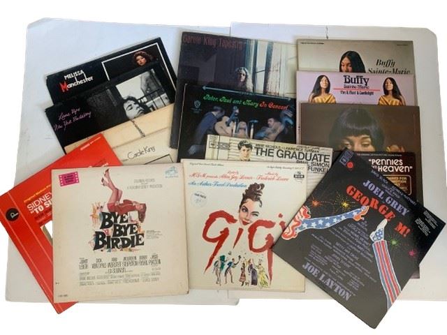 A collection of vintage records including The soundtrack for Bye-Bye Birdie, to Sir with Love featuring Sidney Poitier, Gigi, George M featuring coach Joel Grey, The Graduate, and Pennies from Heaven. Also includes nine records featuring Carole King, Peter Paul and Mary, Melissa Manchester, Laura Nyro, and Buffy Sainte Marie.