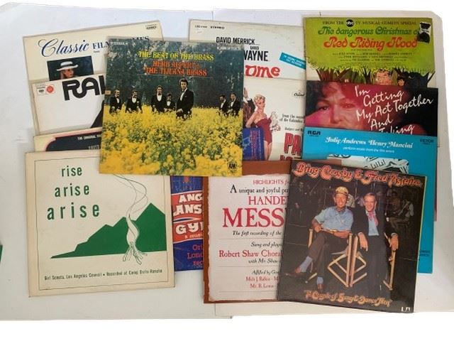 A collection of vintage records including the Beat of the Brass- Herb Alpert and the Tijuana brass, Bing Crosby and Fred Astaire in A Couple of Song and Dance Men, Highlights from Handels Messiah, Jim Dale in Barnum, Julie Andrews and Darling Lily, I’m getting my act together and taking it on the road, Risa Risa rise Girl Scouts Los Angeles Council, Angela Lansbury and Gypsy, Rogers and Hearts Pal Joey, Carol Channing in Hello Dolly, Raisin, The Happy Time featuring Robert Goulet and David Wayne, The Dangerous Christmas of Red Riding Hood featuring Liza Minnelli as Red Riding Hood and Vic Damone as a special guest star, and classic film themes from Elvira Madigan, Death in Venice, 2001 A Space Odyssey, and The Anonymous Venetian.