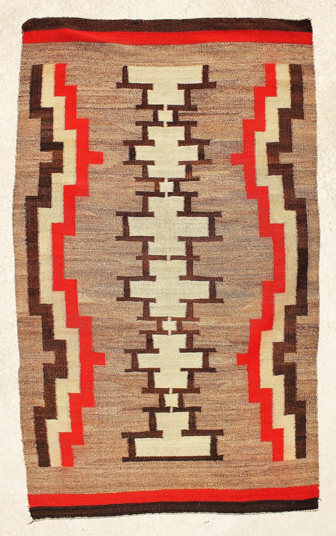 1930’s Trading Post Style featuring a stylized Storm design center area. Clean strong color grouping, with red, natural tan, dark brown and white color scheme throughout. Very nice eye appeal. Measures approx. 43" x 72".