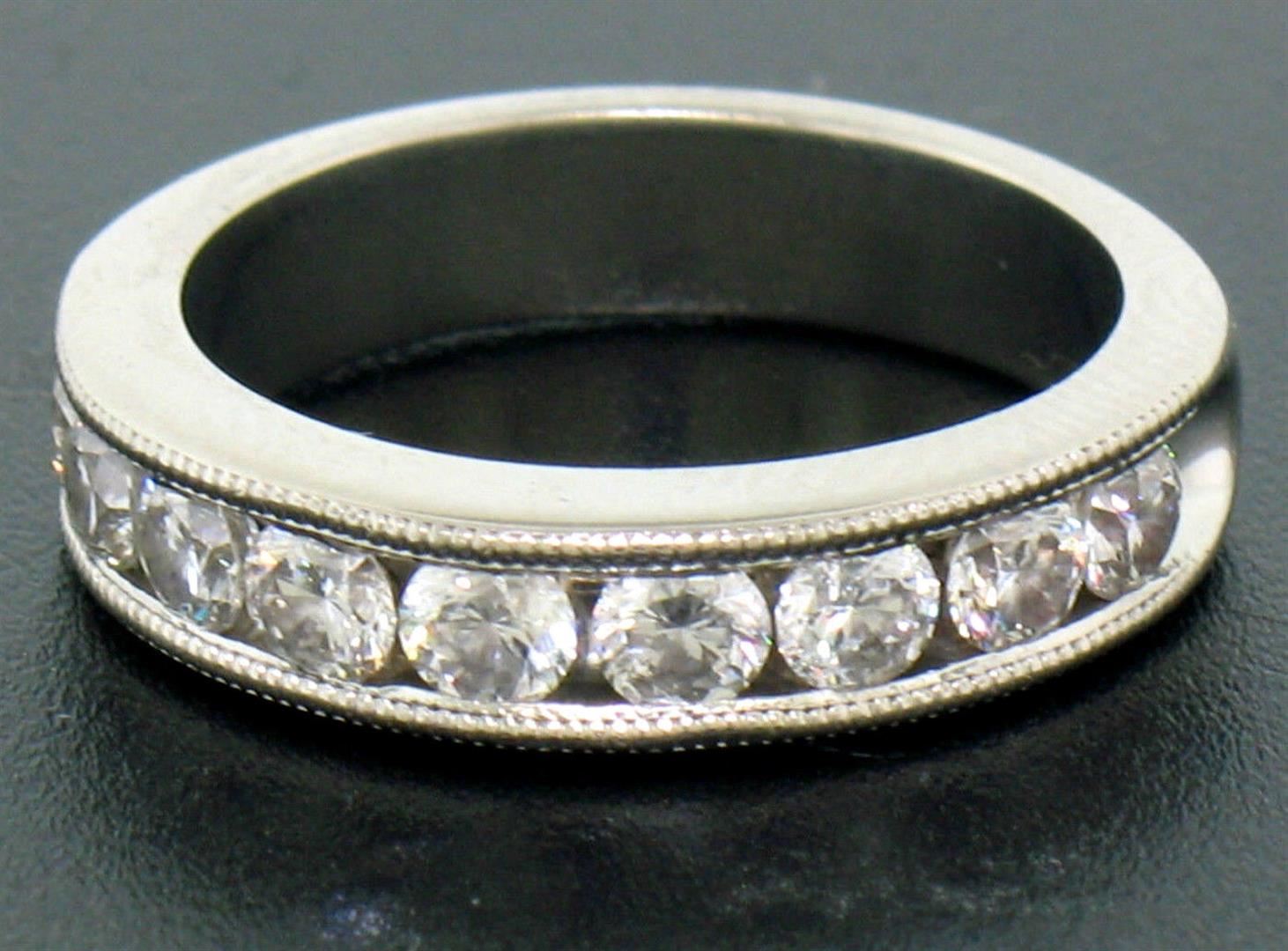 An estate solid Palladium band ring, with 9 round brilliant cut natural diamonds ( F/G- VS2/SI1; 1.08ctw ). The ring is size 5.25, weighs a total of 5.3 grams, and measures 4.62mm wide.