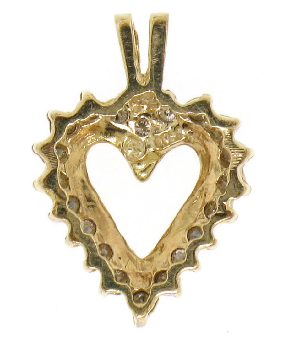 Classic Petite 10K Yellow Gold 0.46ctw Diamond Framed Open Heart Charm Pendant. Please see photos and description for all available information. An estate solid 10k yellow gold heart pendant, with 21 round brilliant cut natural diamonds (SI1; 0.46ctw). The pendant weighs a total of 1.1 grams, measures 17.36x12.27mm including the bail.