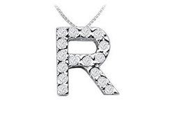 Sixteen brilliant-cut round diamonds are prong-set in a timeless classic letter R to wear your personality in a more simple yet elegant way. Made in 14K white gold this initial pendant has a total weight (TDW) of 0.15 ct.