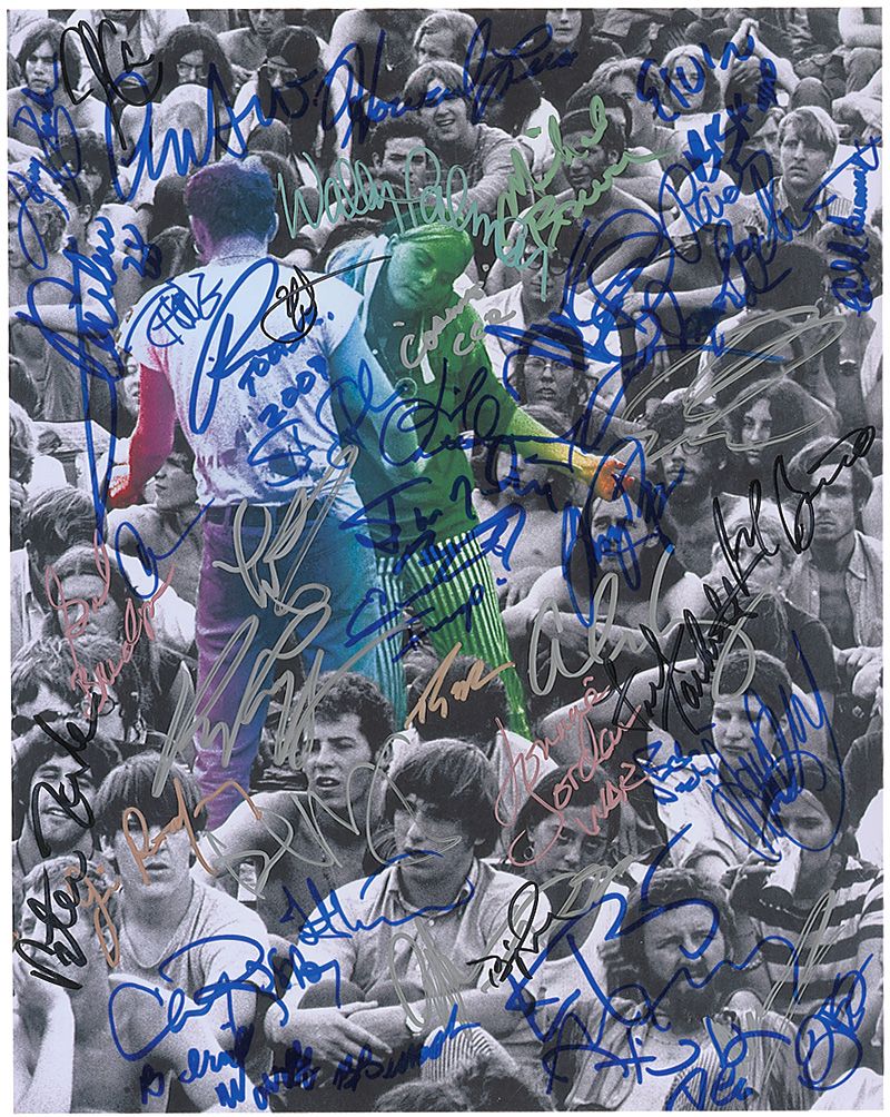 Glossy 11 x 14 photo of a couple dancing in the middle of a concert crowd, signed in felt tip and ink by 51 musicians. Signers are: Alice Cooper; Journey’s Neal Schon, Ross Valory, Jonathan Cain and Steve Smith; The Guess Who’s Randy Bachman, Jim Kale and Garry Peterson; Bryan Ferry of Roxy Music; Todd Rundgren; Don Wilson of The Ventures; Johnny Mathis; Barry Goldberg of Electric Flag; Peter Tork of The Monkees; Artimus Pyle of Lynyrd Skynyrd; Lil Anthony and Ernest Wright of Lil Anthony and the Imperials; Kenny Loggins; Frank Marino of Mahogany Rush; Elvin Bishop; Chris Dreja and Jim McCarty of The Yardbirds; Chuck Negron of Three Dog Night; Tommy Chong; Paul Barrere, Bill Payne, Fred Tackett of Little Feat; War’s Lonnie Jordan, BB Dickerson, Harold Brown and Howard E. Scott; Gil Bridges and Ray Monette of Rare Earth; Larry Graham of Graham Central Station; Bernie Worrell of Parliament Funkadelic; Bob Welch of Fleetwood Mac; Christopher Cross; Chuck Panozzo of Styx; Neal Doughty of REO Speedwagon; David Hildago, Cesar Rosas, Conrad Lozano, Louie Perez of Los Lobos; Howard Leese of Heart; Tina Weymouth of Talking Heads; Russell Hitchcock of Air Supply; Wally Palmar of The Romantics; David Lindey; Michael Brewer of Brewer & Shipley; Jeff Carlisi of 38 Special; and Jim Rodford of The Kinks. In fine condition, with some light contrast to a few of the signatures.